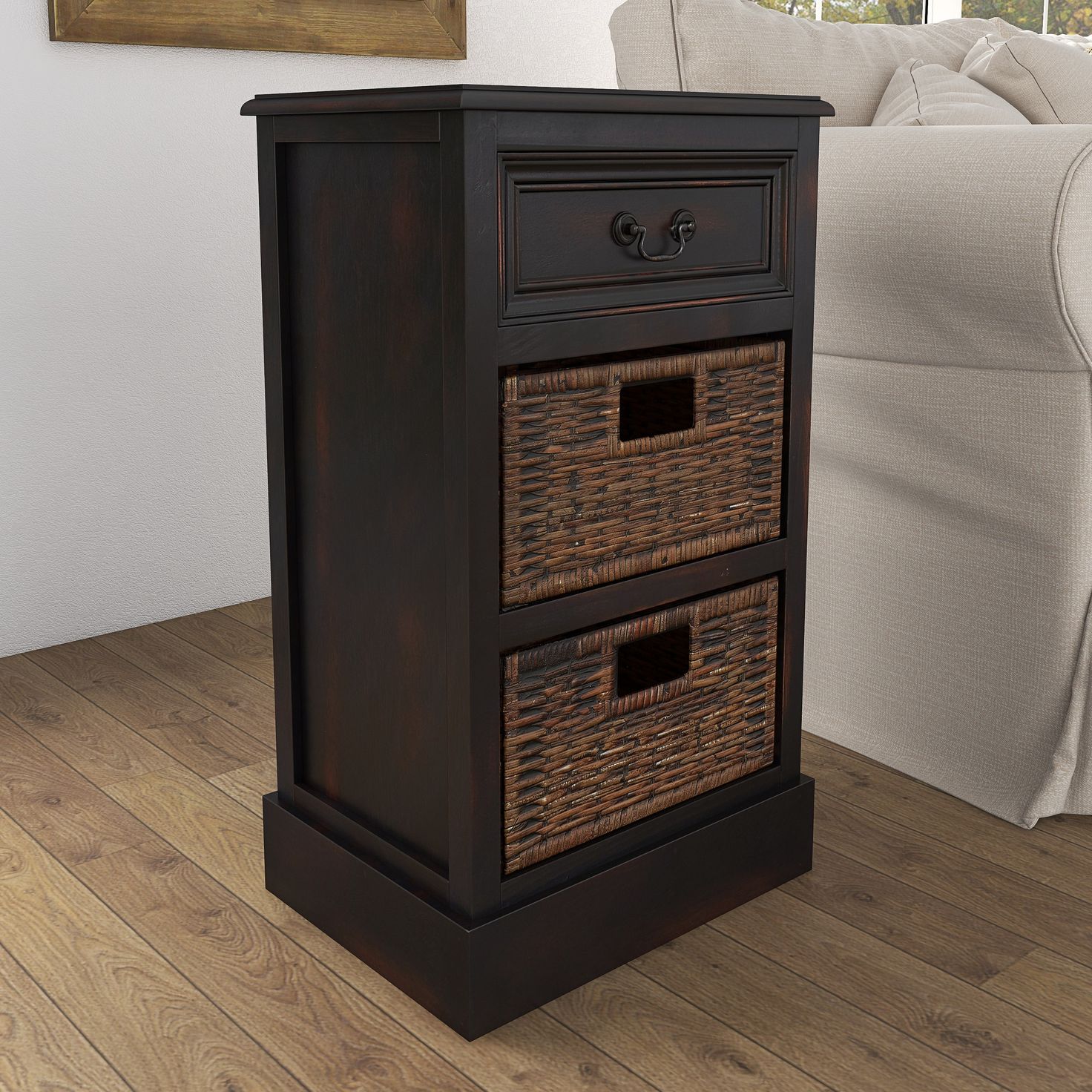 • Includes a single pull-out drawer and two removable wicker baskets.