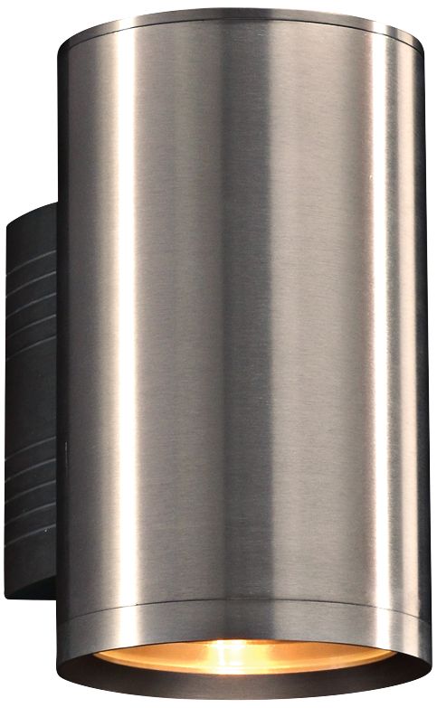 This sleek, small, brushed aluminum outdoor wall light is a modern, cylindrical fixture illuminated with an energy-efficient LED module. Its downlight design sends light out the bottom of the cylinder through a clear glass diffuser lens. Looks great alone, in pairs, or in groupings of three or more, and it costs little to operate.