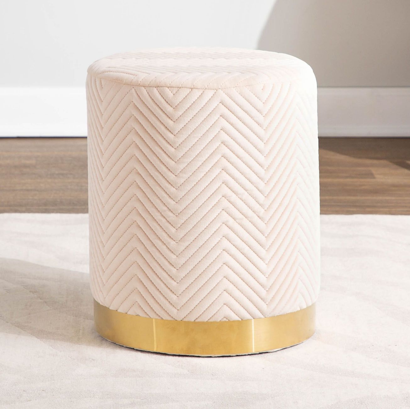 Chevron makes an exciting pattern on this contemporary ottoman by LumiSource. Cream chevron pattern velvet fabric brings out the glam in your space. This piece is supported on a gold steel base for visual appeal.