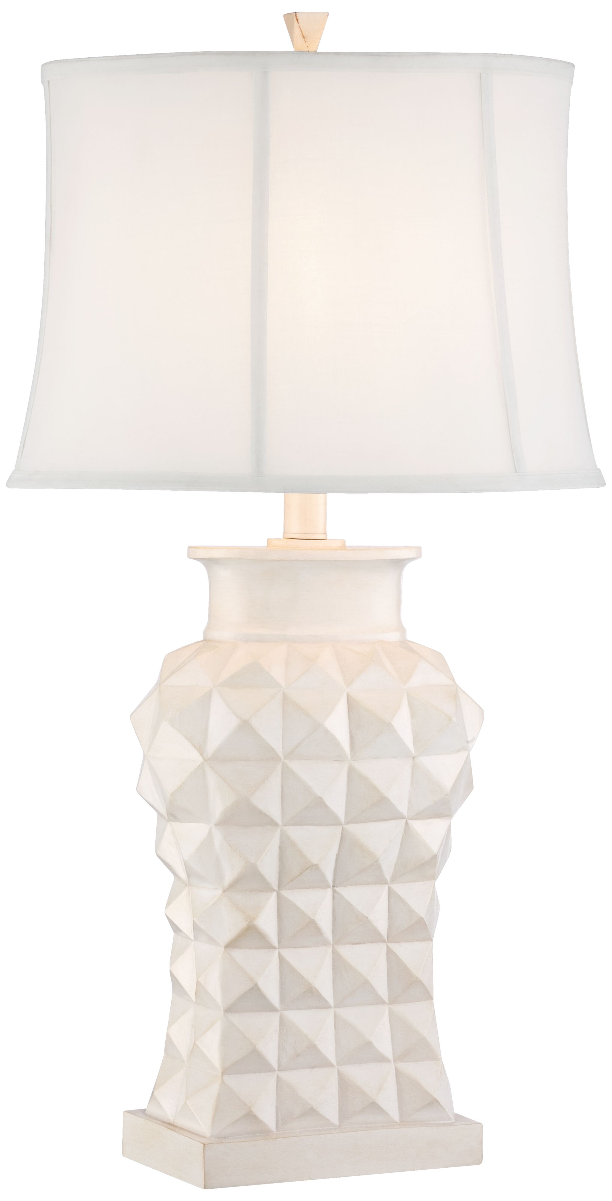 An all-over pyramid base design sits on top of a rectangular base in this striking look. An ivory finish adorns the base for a chic look. Topped with an oval shade. From the Regency Hill collection of table lamps.