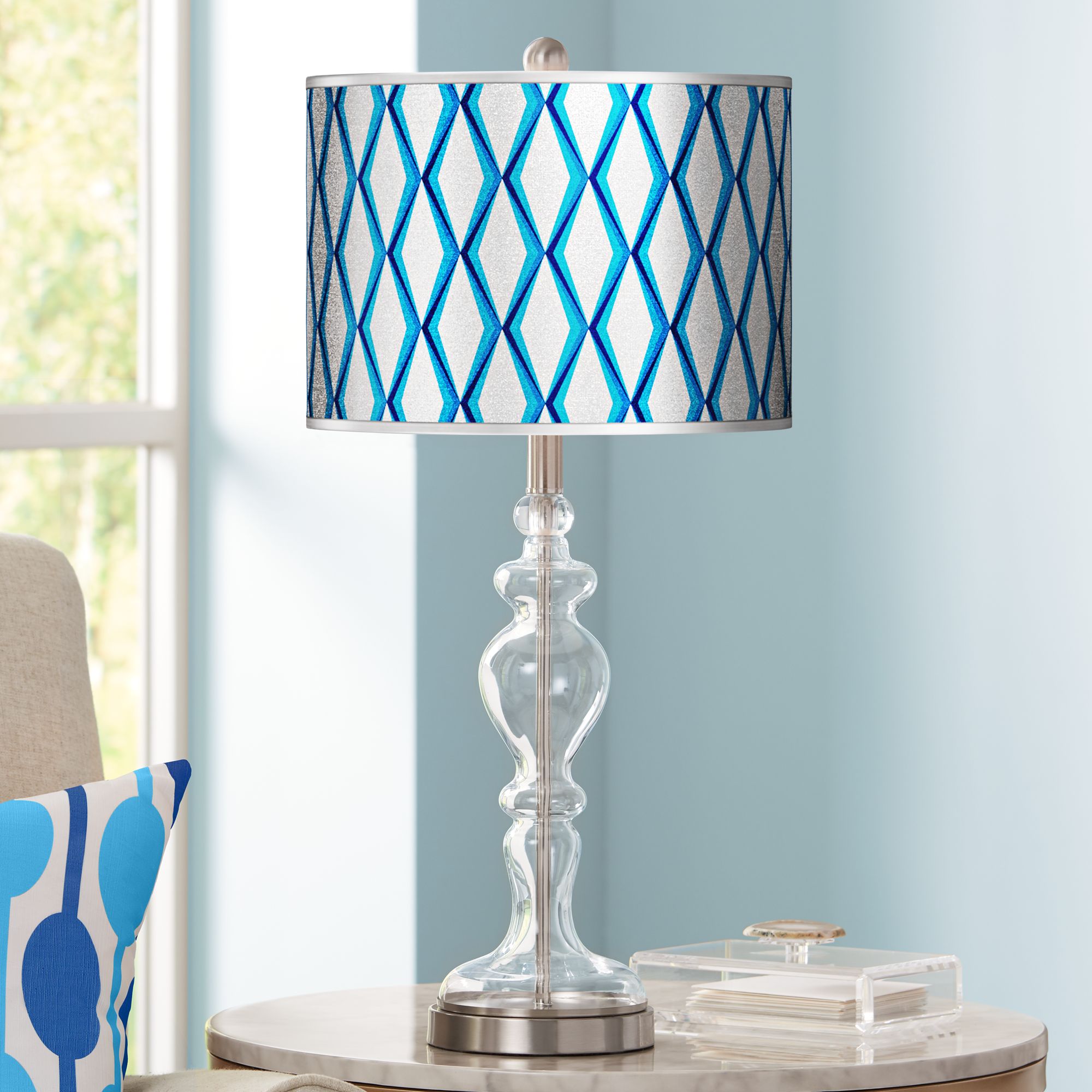 - Clear glass table lamp. Opaque shade that casts light upwards and downwards.