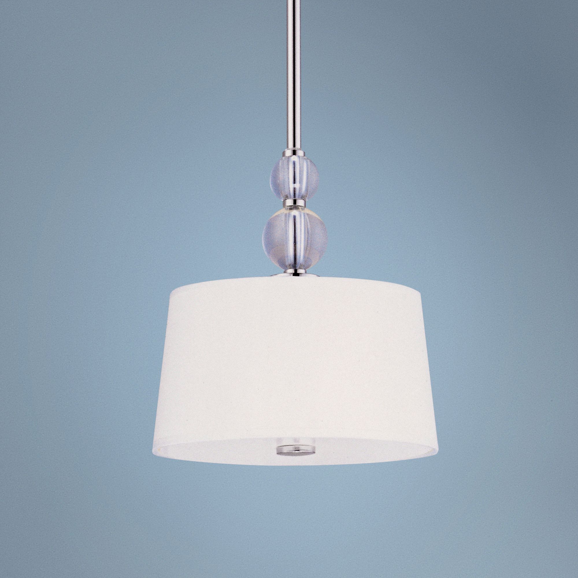 The stylish Rondo mini pendant light features a polished nickel finish and a white fabric shade. Round crystal glass balls are a small detail that gives a big impression. From Maxim Lighting.