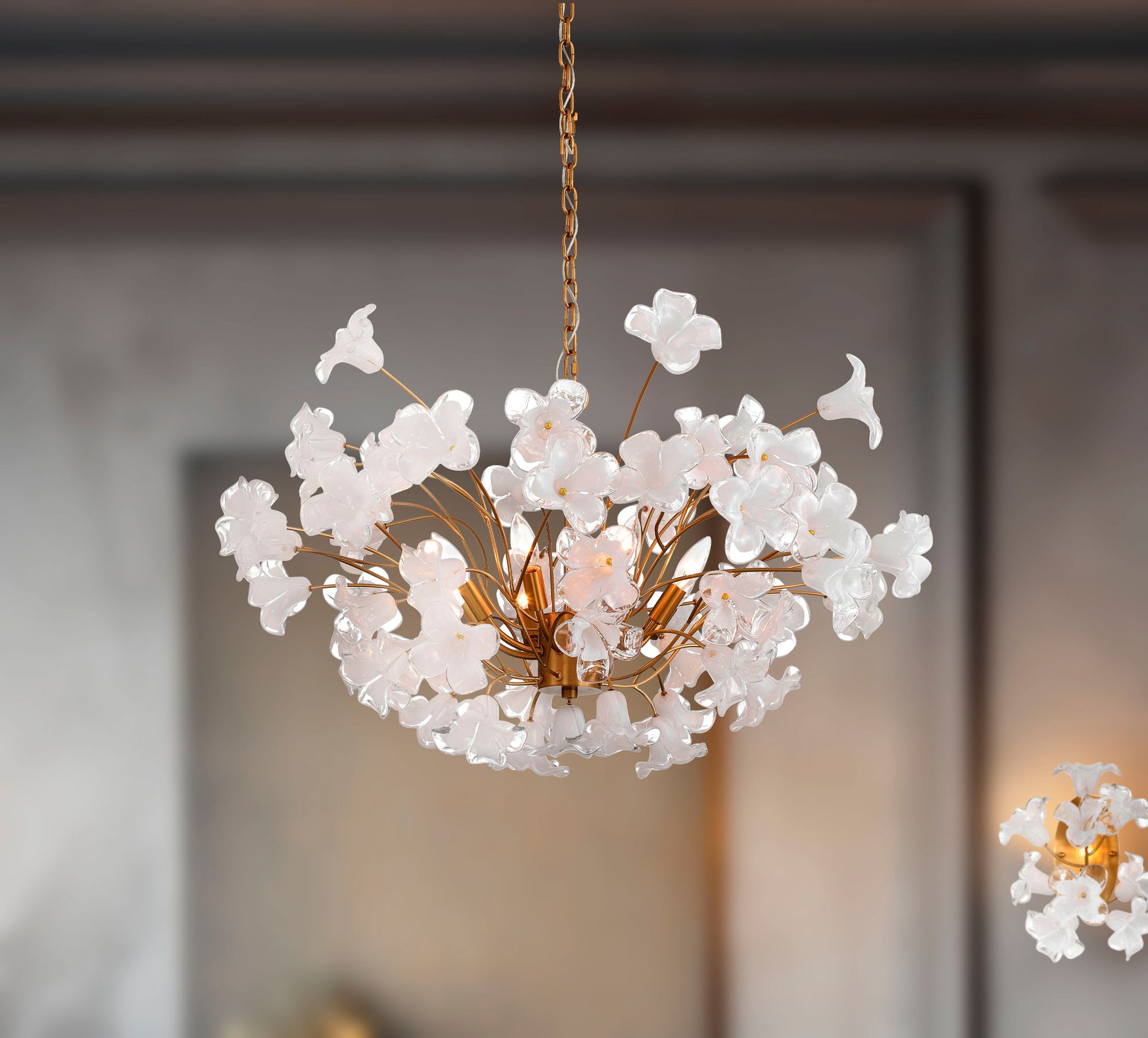- Legacy brass finish over steel frame. Clear hand-made glass flower shades.