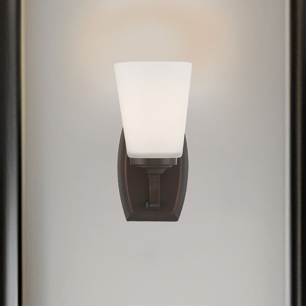 Subtle sophistication defines this contemporary wall sconce. From the Overland Park collection by Minka Lavery, the vintage bronze finish enhances the sculptural elegance of the etched white glass cone shade. Its refined design makes it an excellent choice for hallways or living areas, adding warmth and style to any space.