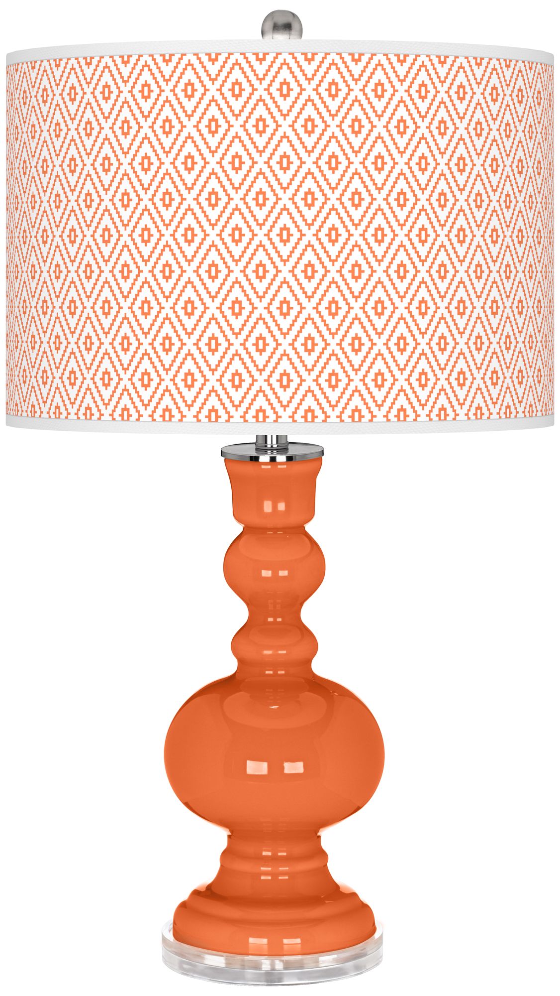 This apothecary style Color + Plus™ glass table lamp will infuse your decor with brilliant color and style. This beautiful Nectarine designer lamp is hand-crafted by experienced artisans in our California workshops. It stands on a lucite base, and is topped with a custom made-to-order shade that features a Diamonds pattern in rich color tones that complement the base hue. Lamp base U.S. Patent # 8,899,798. Shade printing process U.S. Patent # 7,347,593.