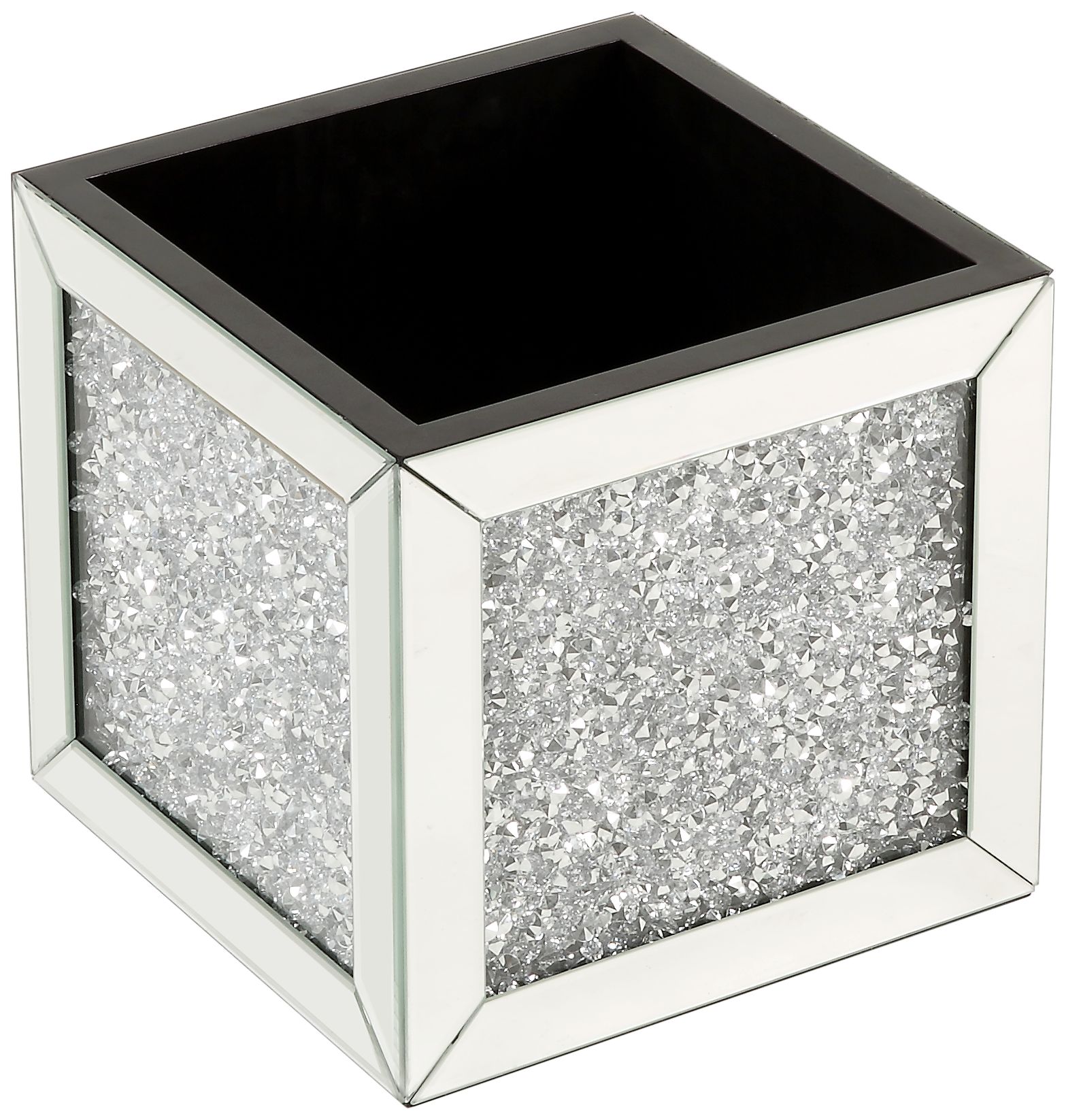 - Black faux leather. Mirrored glass finish. MDF wood frame construction. Faux diamonds inlay. Made of acrylic. Hand-crafted diamond tufted detailing.