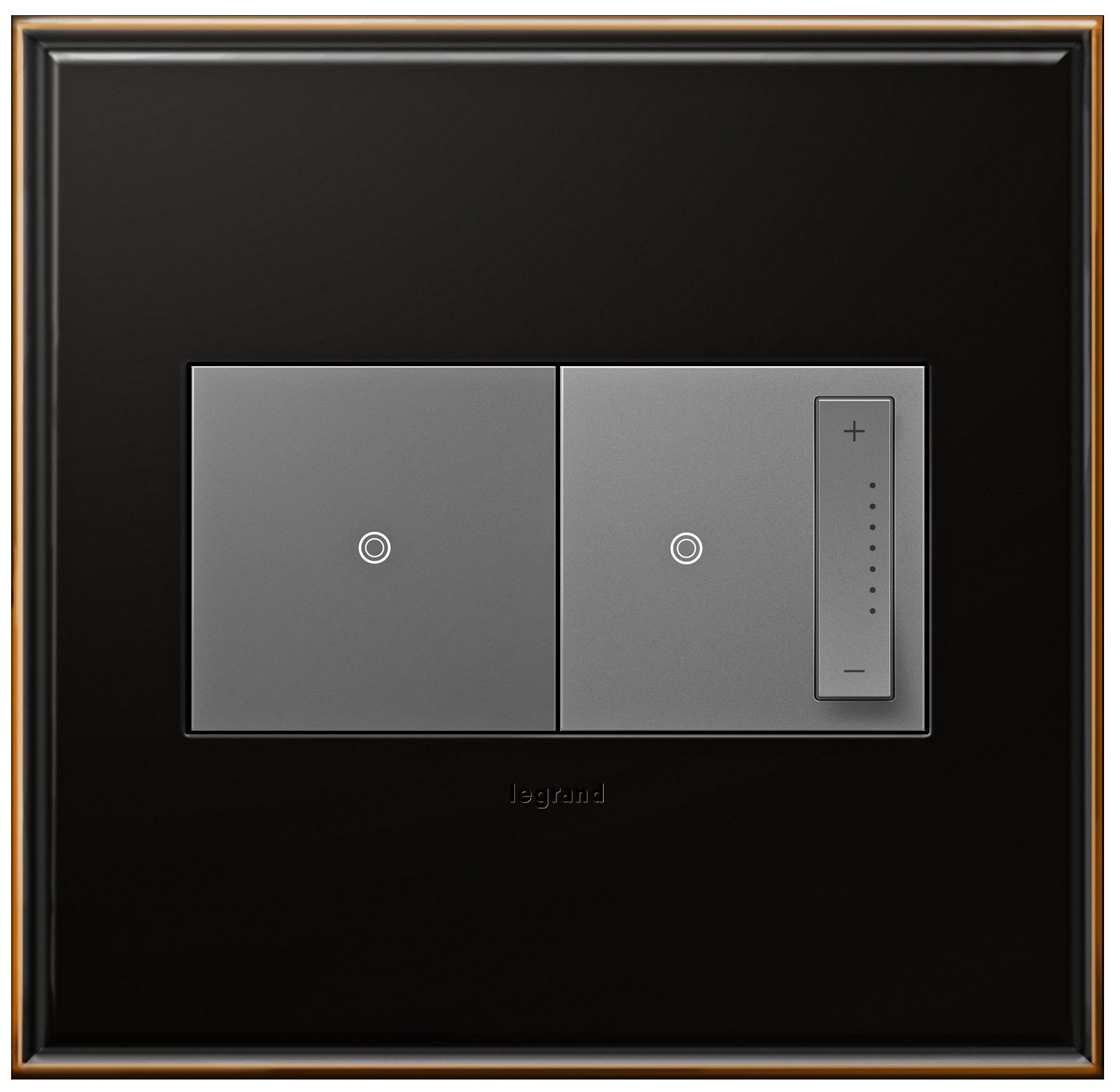 With its polished elegance, the adorne® oil-rubbed bronze 2-gang cast metal wall plate with 15A sofTap switch and 700W Tru-Universal sofTap dimmer by Legrand is a sleek look for modern interiors. This plate's clean lines are emphasized with its lovely smooth finish and no visible screws. Interior range comes in a complementary magnesium finish, and features a sofTap switch with innovative micro-movement functionality - which allows lights to be turned on and off with a soft touch of the finger. Accompanying Tru-Universal dimmer includes a unique paddle to adjust light levels, and can adapt to any load / combination of loads (incandescent / halogen, CFL / LED, etc.) attached to them, without flickering or early dropout. Easy 1-1 installation allows the wall plate to be fitted over the switch without running new wires. Stylish design meets ease and function with adorne's wall plate combinations.