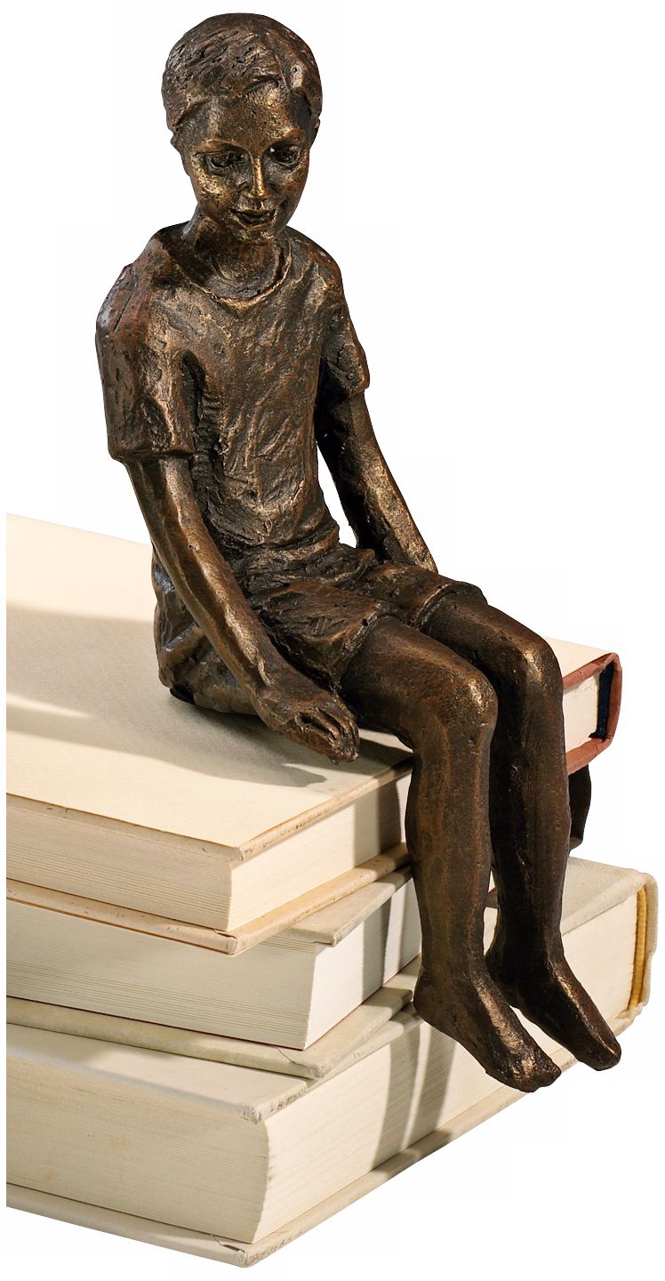 Place this boy shelf figurine on a bookcase or fireplace mantel. Seated and eager to be a wonderful home decor accent, this young man is constructed of iron and features an oil rubbed bronze finish. This delightful sculpture will retain his child-like charm for years to come. Includes only boy figure; girl figure not included.