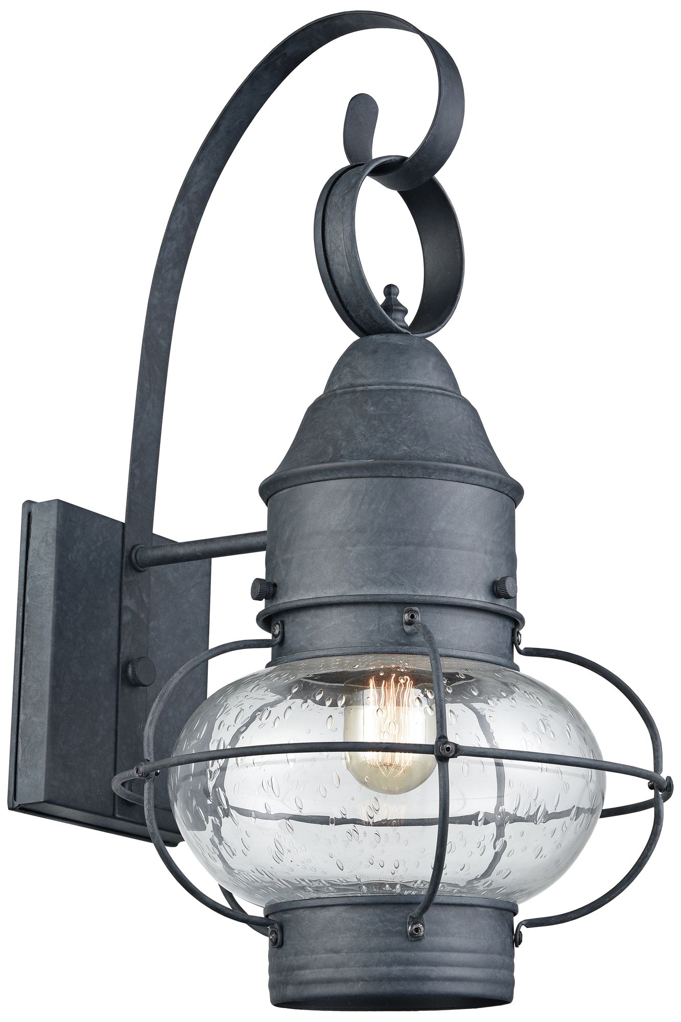 Let the charm of industrial farmhouse design shine through with this onion outdoor wall light. Featuring an aged zinc finish over a metal cage frame, this pretty light creates a timeless rustic ambiance that's both bold and inviting. The clear seeded glass shade softens the light, adding an enchanting glow to your outdoor spaces.