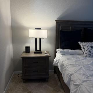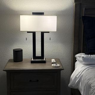 This lamp is both attractive and functional. It is perfect between our two recliners so we can each have light as we desire without taking the space of two lamps on the end table. We LOVE the fact that there is a USB plug in for charging on the base of the lamp. We use it daily. When the dogs run by it, it does not wobble. And, I stick the catalogs that arrive in the space in the middle so when I sit in my recliner, I can work my way through them. Very Handy! The rectangular lamp shade is a treat as it does not stick out into the walk way and nestles up close to the wall just like I needed. As you can tell, we got more than one! Actually, we liked this lamp so much that we now have 4!