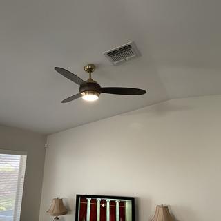 A 54" LED ceiling fan featuring a lovely bronze finish motor, three matching blades, and a soft brass metal accent finish.