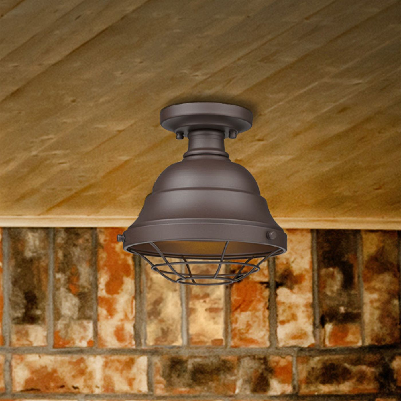 A perfect blend of industrial and farmhouse design produces a light fixture that adds personality to any space. UV coated textured bronze finish over steel construction ensures that sun damage will kept to a bare minimum, while a lovely painted shade interior enhances light quality. This UV-coated textured bronze finish steel one-light flushmount ceiling light features a caged diffuser and exposed hardware.