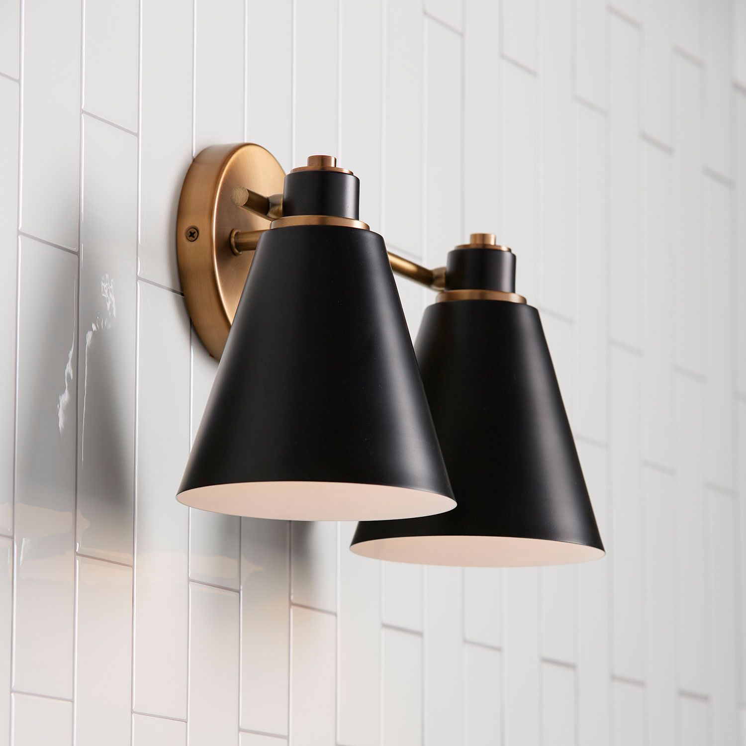 Bring a bold, modern look to traditional bath lighting with the Bradley 2-Light Vanity. The Aged Brass accents and crisp metal shades bring distinct style, while the Matte Black exterior and White interior shade finishes create down-light illumination that is perfect for powder rooms or focused task lighting.