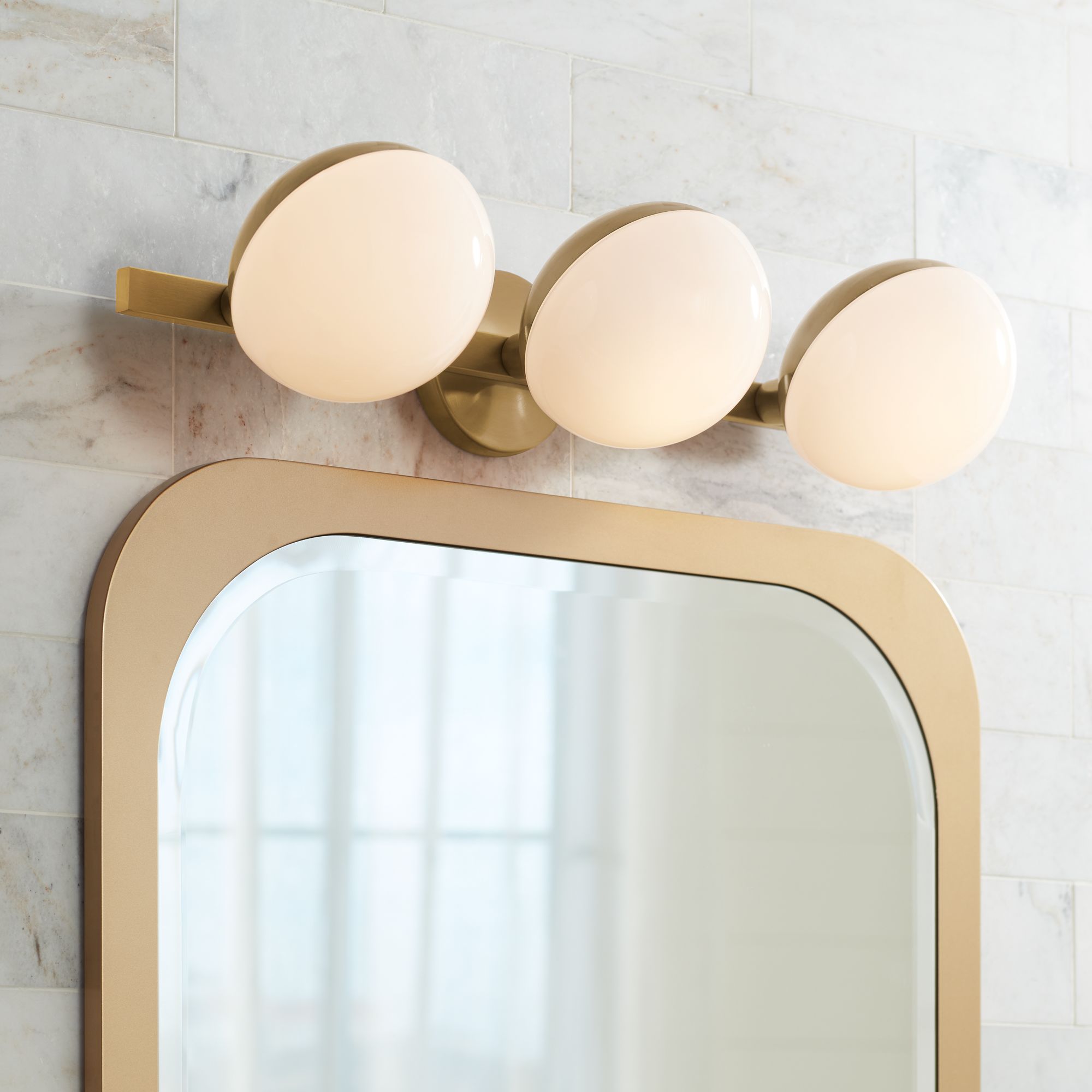 Eye-catching charm has arrived in the Celine three light bathroom vanity light from the Possini Euro Design® brand. Three round opal white glass globes are the centerpiece of this warm brass finish fixture, offering diffused illumination from the four bulbs housed within. Gentle curves and soft edges create a welcoming environment into your home. Damp location rated for indoor use.
