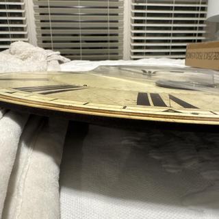 - Weathered and laminated clock face. Brass center components. Internal pendulum with small round window view.