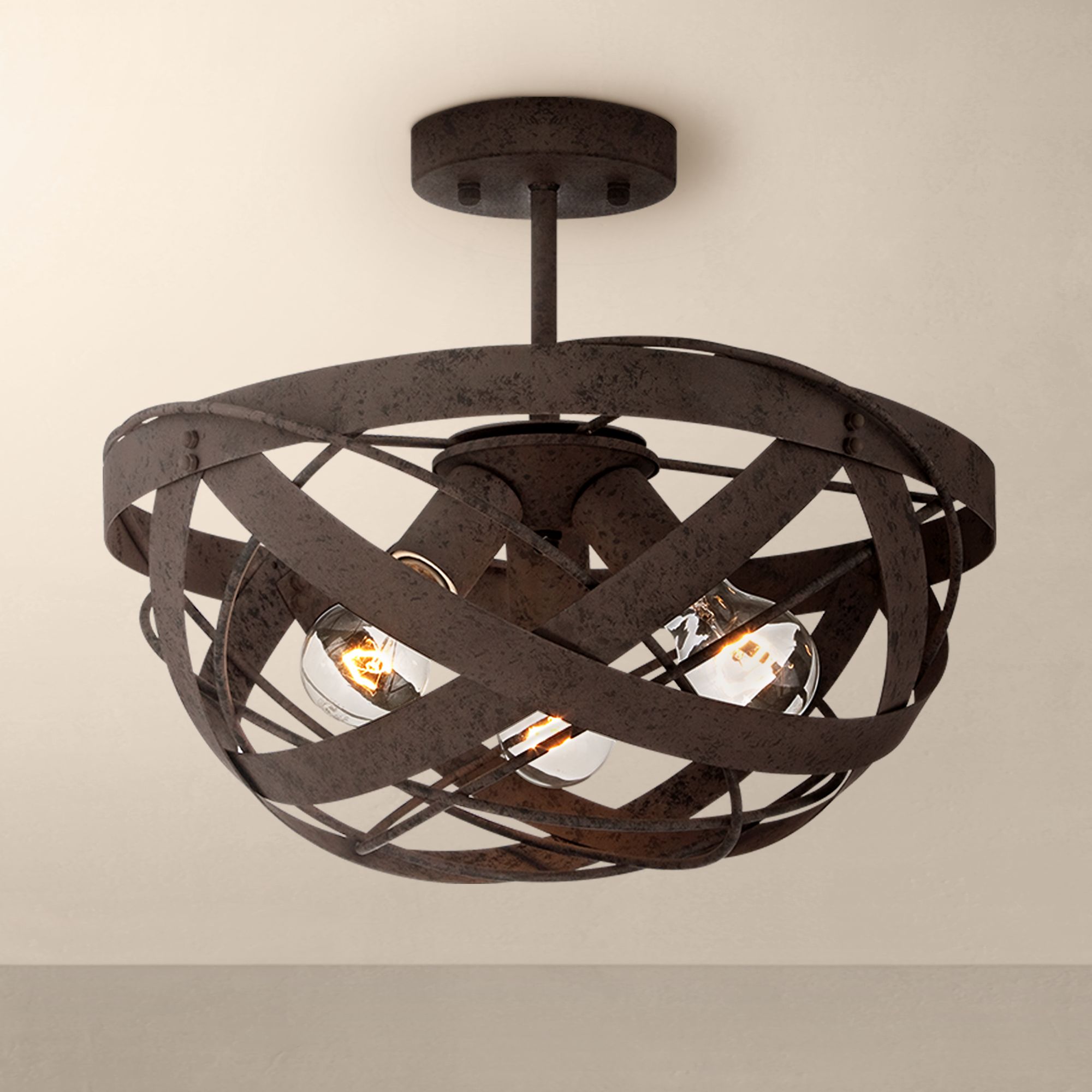 This industrial style ceiling light features the look of a classic woven basket. Constructed of metal, this half-round fixture is finished in a natural rust with appropriate texturing. The "basket" wraps around three bulbs that will illuminate your surroundings as it brightens up your tasteful decor.