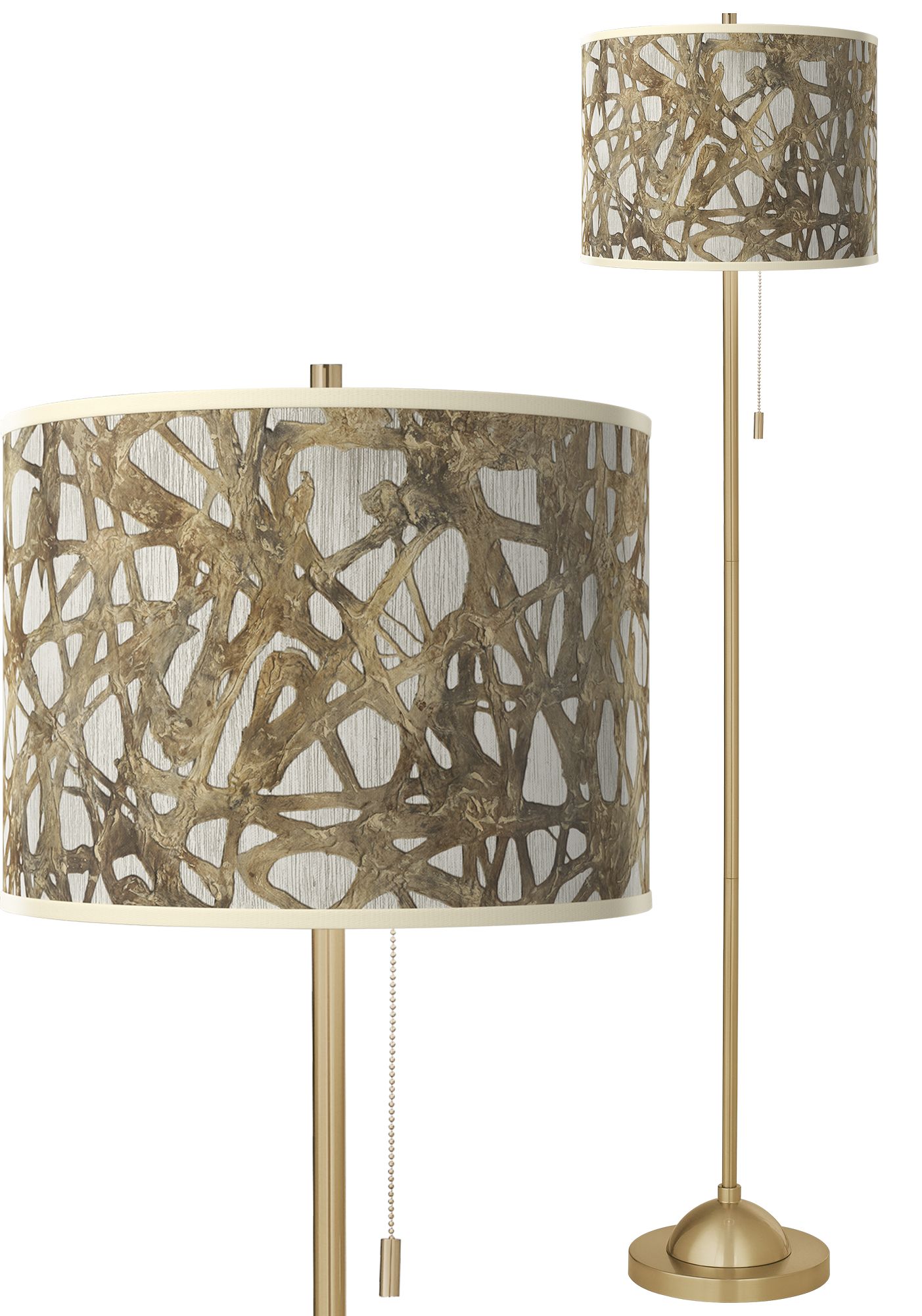 Brighten your home with this modern style stick floor lamp. It features a warm gold finish and is topped by a classic drum shade for a clean look. The shade has an exclusive Organic Nest pattern and is giclee printed and made to order. An on-off pull chain switch allows for easy lighting control. Shade printing process U.S. Patent # 7,347,593.