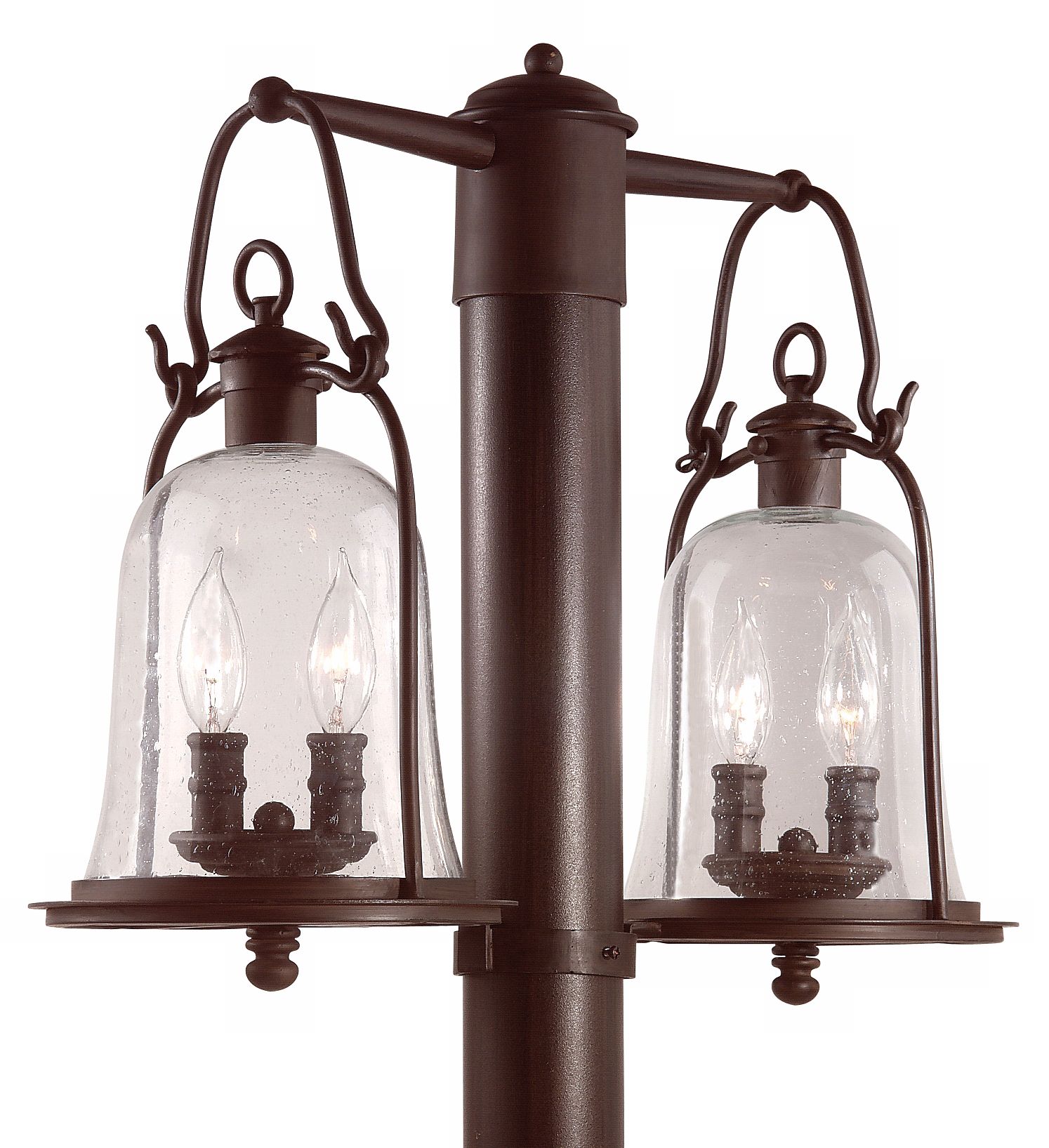 From the Owings Mill lighting collection, this outdoor post light shines adds a bright shine to your outdoor spaces. It features a double lantern design in hand-forged iron and lantern hook tops. Clear seeded glass provides a bright light throw. Natural bronze finish. Post mount style light. Post (style number 58377) not included.