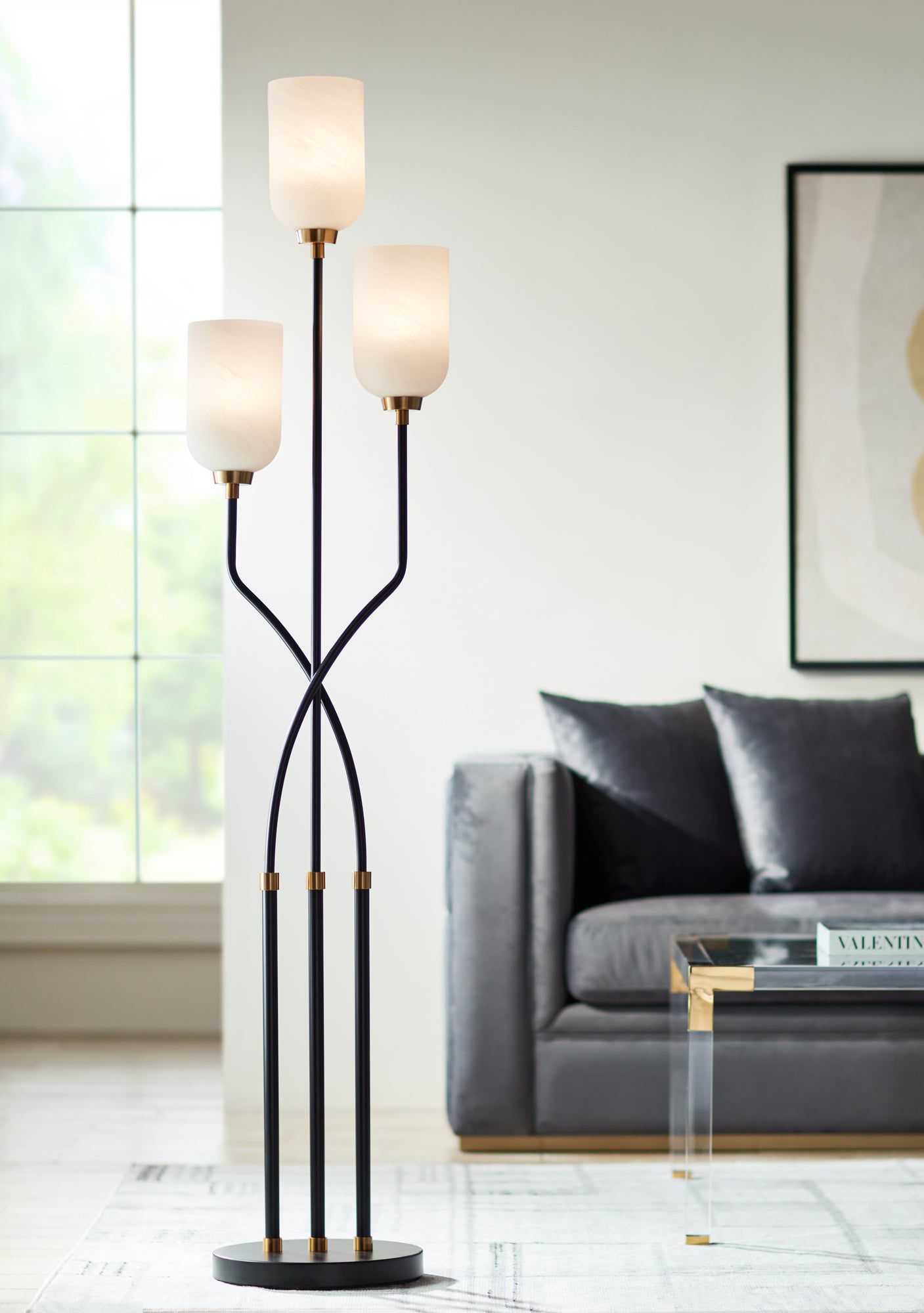 Ideal for dark room corners, hallway lighting, or foyer accent lighting, this three light floor lamp shines. From the Pacific Coast Lighting brand, it features a dark bronze-black metal base and arms with gold finish accents. White alabaster glass direct light upwards and out for general room lighting.
