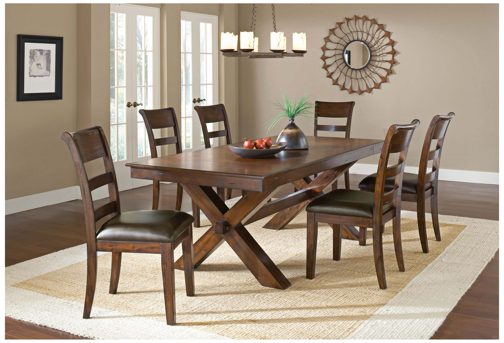 • Features trestle style dining table and ladder back style chairs.