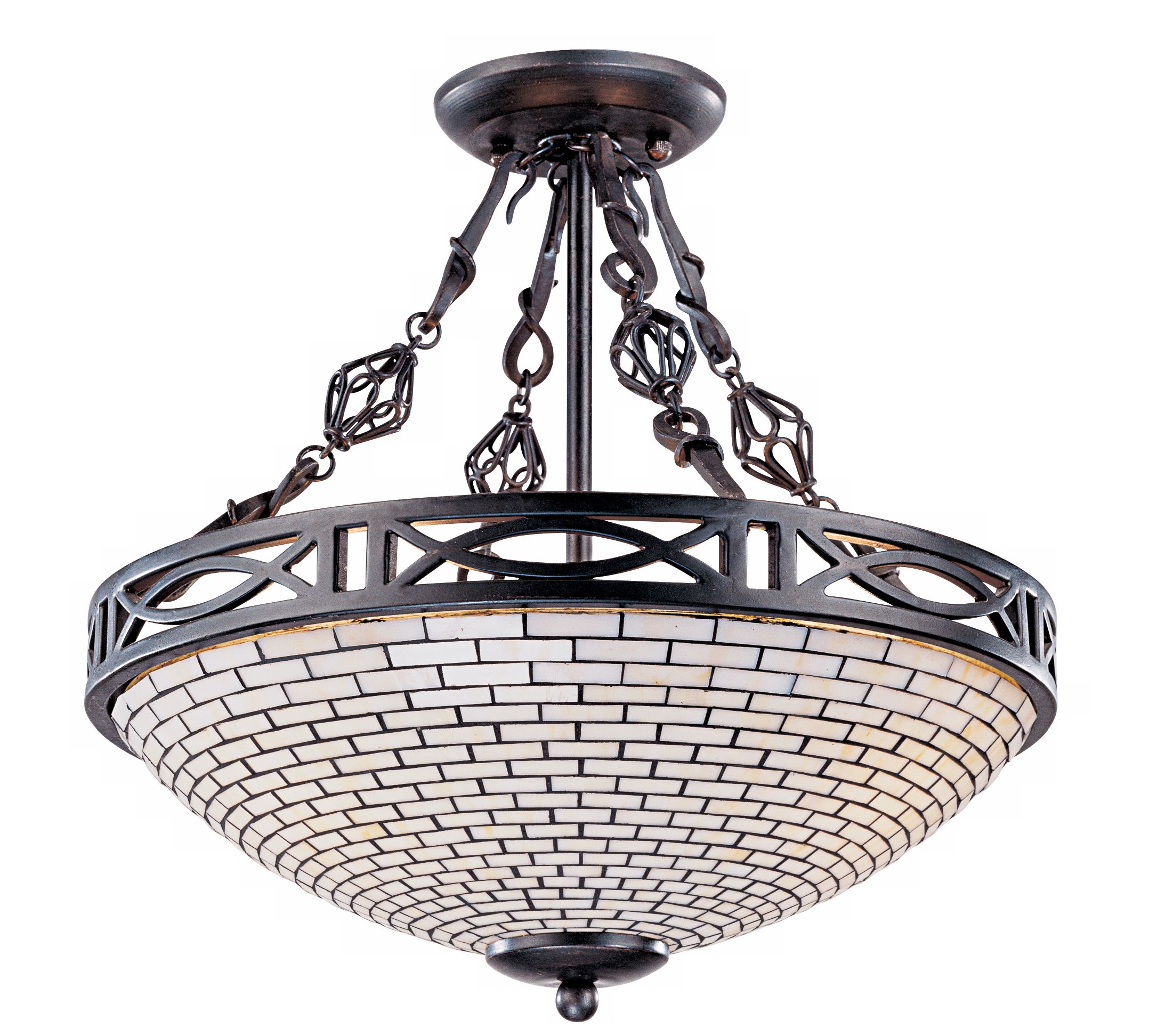 This semi flush makes a glamorous statement in any entry way or room. Beautiful mosaic tiles in a pearlescent glass create a lustrous shine. The fixture is intricately designed with framed interloping lines forming a border around the top of the pendant's mosaic bowl. By Franking Iron Works™.