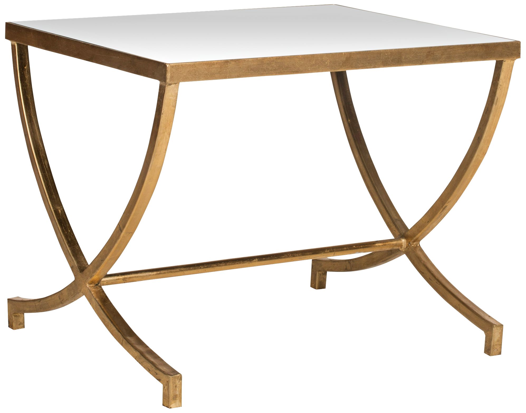 This graceful iron accent table is crafted with a stunning gold-leaf finish base and mirrored top.