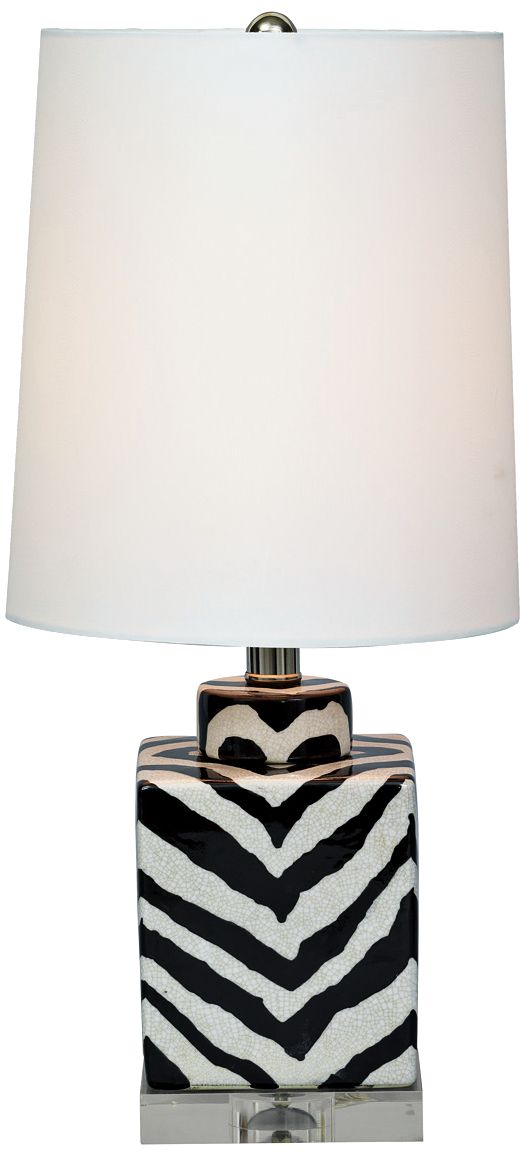 Give any space a new look with this modern mini porcelain table lamp. A black and white zebra print provides an eye-catching element that's complemented by a hardback drum shade. Atop a square lucite base to complete the look. From the Kenya collection by Port 68.