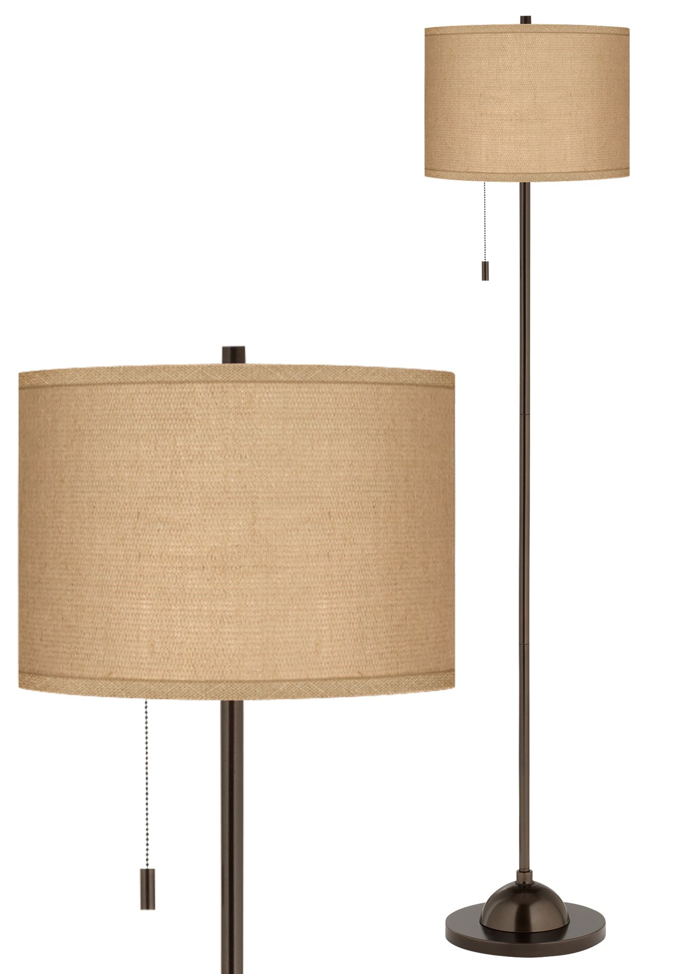 Add style to your favorite room with this club style floor lamp. The lamp comes in a tiger bronze finish and has a slim profile perfect for seating areas, bedrooms and more. Up top is a hand-assembled woven burlap fabric drum shade. An on-off pull chain hang-below the shade within easy reach.
