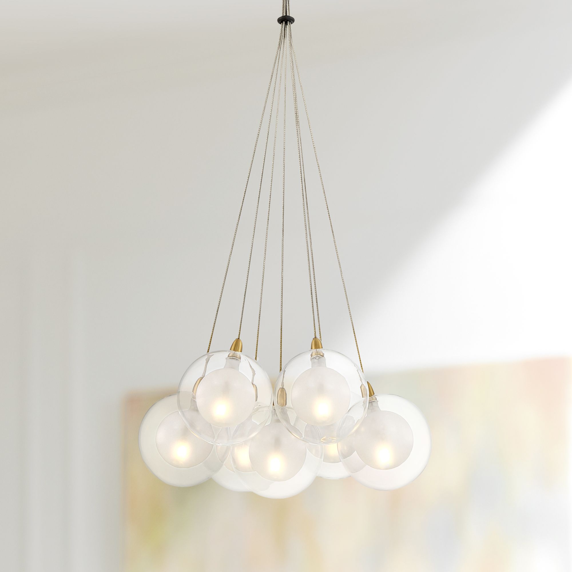 From Possini Euro Design®, a modern seven-light pendant delivers a touch of glamour to an entry or dining room. Its clear glass orb shades cluster dramatically, creating a bubble-like arrangement. The layered look is embellished with a gold finish frame and canopy for a last touch of warmth and elegance.