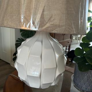 This classic mid-century modern table lamp features a handsome ceramic base with a dramatic design. The resulting look is full and rich with a texture that is both eye-catching and stylishly sculpted. It's topped with a linen drum shade that provides a natural complement to the white finish below. This lamp comes with a tabletop dimmer, which allows you to control the level of lighting. Simply insert the lamp plug into the dimmer outlet, and then slide the switch on the control to dim or brighten the lighting.