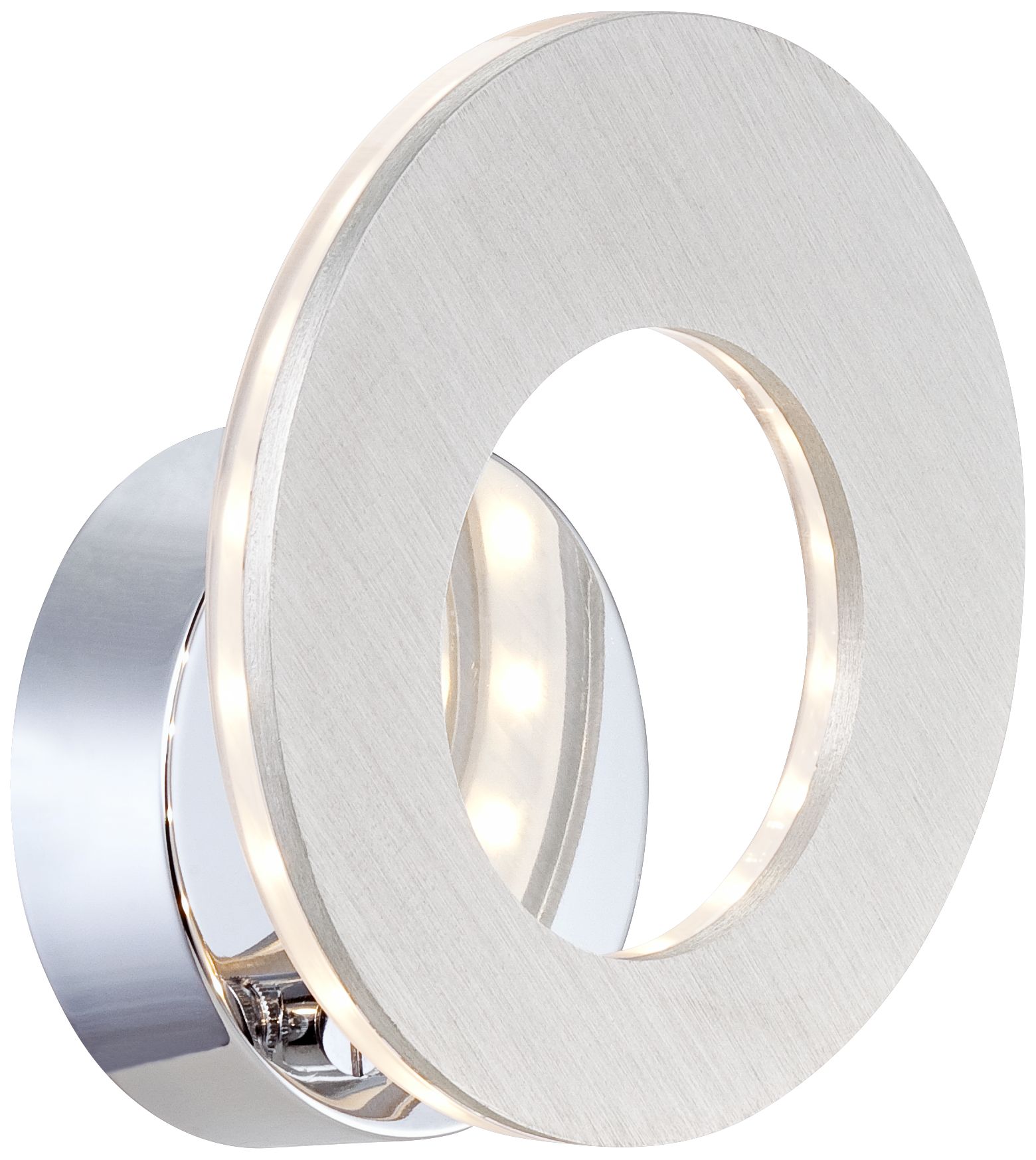 Chic minimalist design is on display in this open-circle brushed aluminum wall sconce lit by energy-saving LEDs. A round polished aluminum wall plate reflects the light from within the frame. From Possini Euro Design lighting.