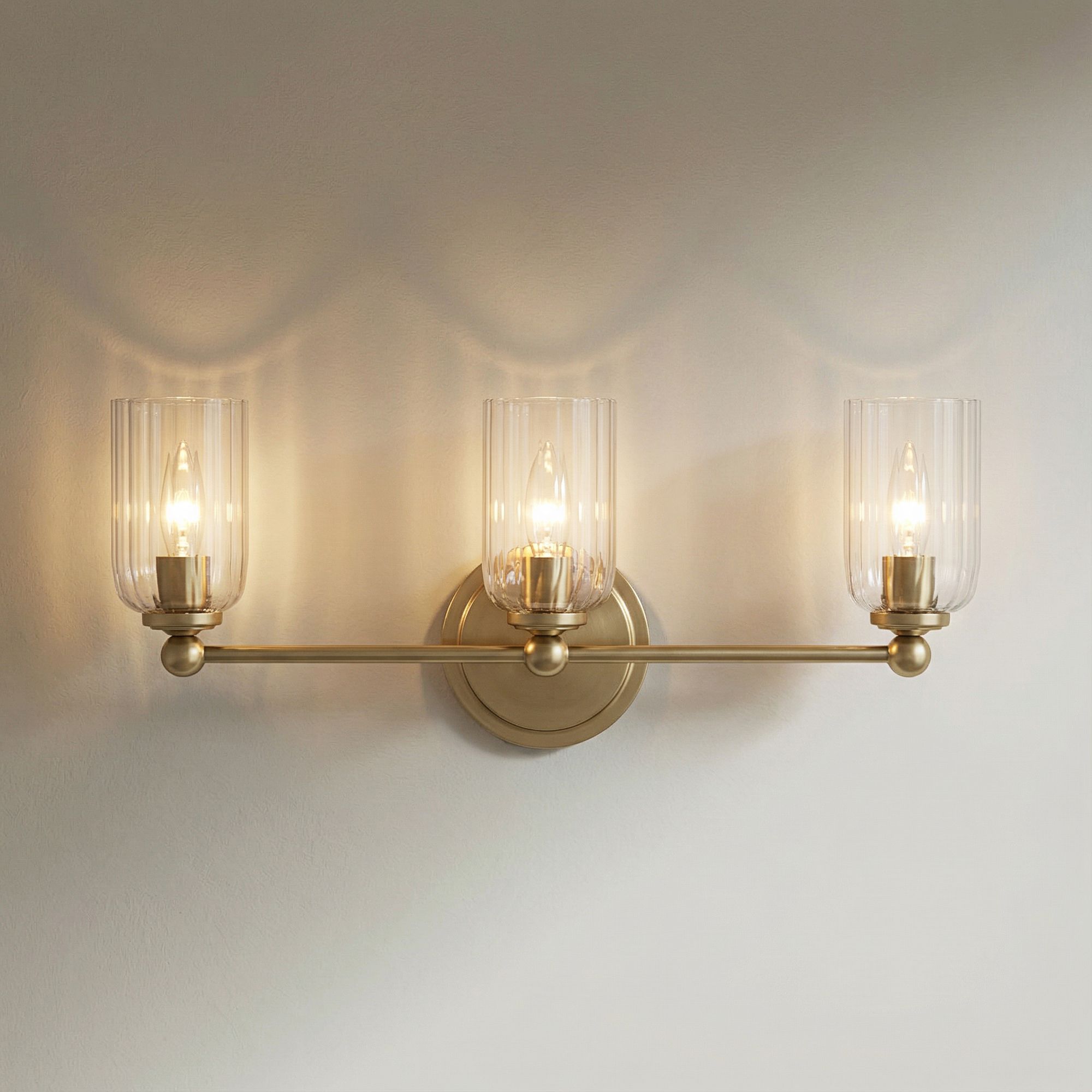 Elevate your bathroom or vanity space with this new traditional style three light fixture in a satin brass finish with clear ribbed glass shades.