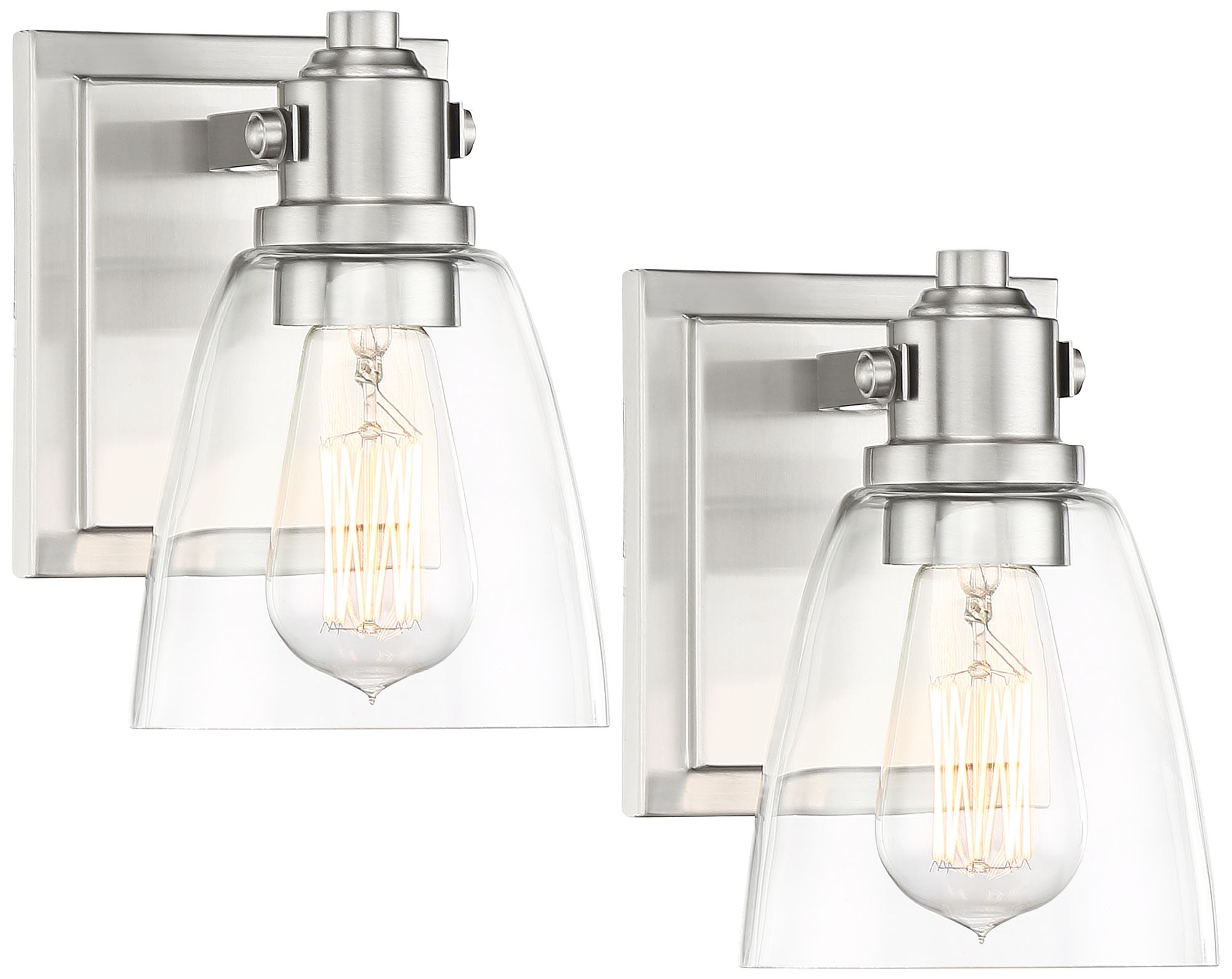 The Osborne collection by Possini Euro Design offers a contemporary design with an industrial bent. This set of two single-light wall sconces comes in a brushed nickel finish for a clean and classic look. Featuring a subtly tapering silhouette, the transparent glass shade allows for a clear focal point of illumination.