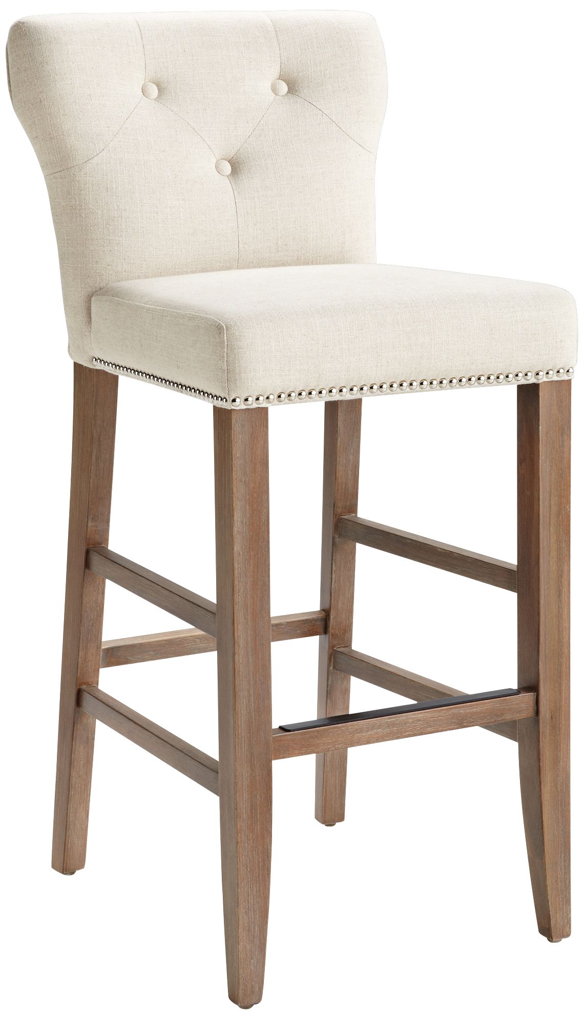 Stylish and classy, this neutral linen upholstered barstool features wonderful silver nail head trim and button tufting on the back.