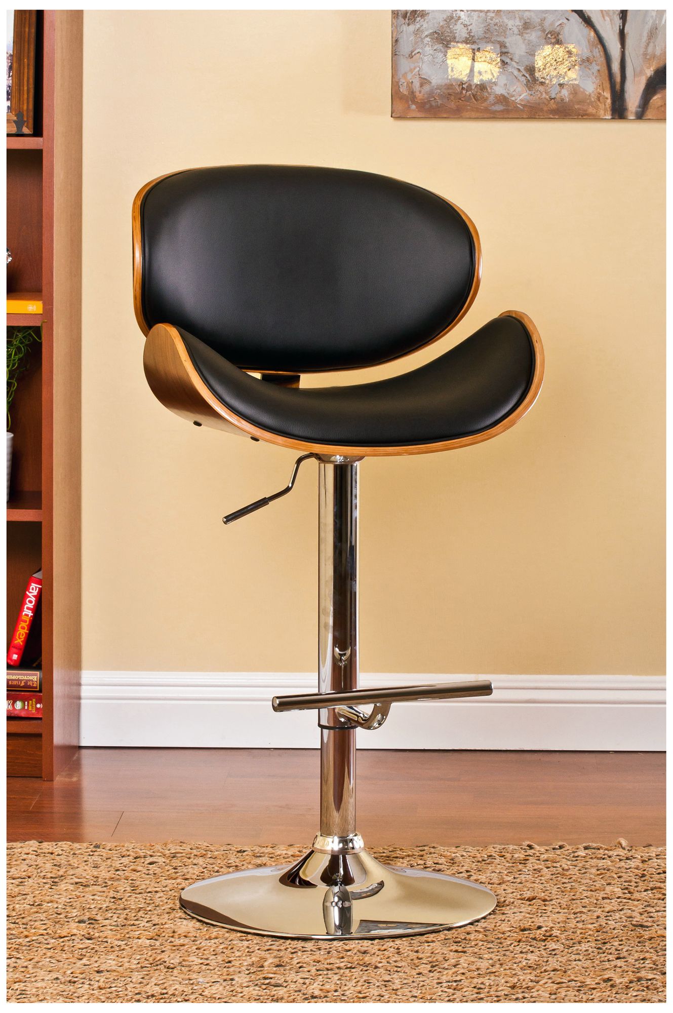 From AC Pacific comes an attractive stool offering a fabulous seating experience and awesome styling. Enjoy the comfort of a wide, sloped seat base and generous seat back. Walnut wood blends beautifully with black faux leather, delivering a wonderful contrast to its polished chrome pedestal and base. With height adjustability and a full 360-degree rotation axis, this swivel adjustable bar stool is a solid choice for any setting.