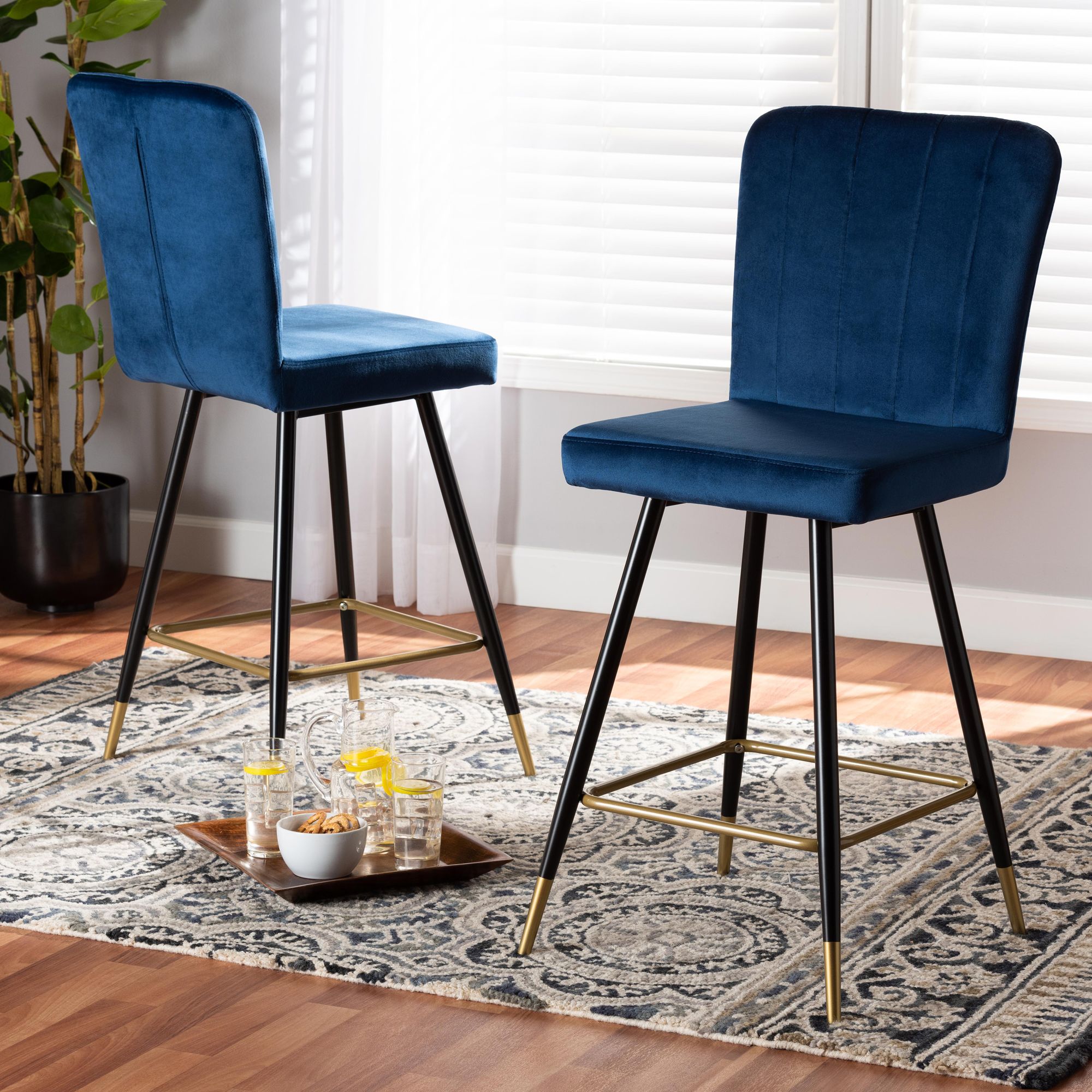 Bring out the best style at the breakfast bar with a set of two navy blue velvet bar stools by Baxton Studio. Hand-crafted channel funnel backrests provide texture and visual appeal. A two-tone black and gold motif on the chair legs make for a stunning display in your space.