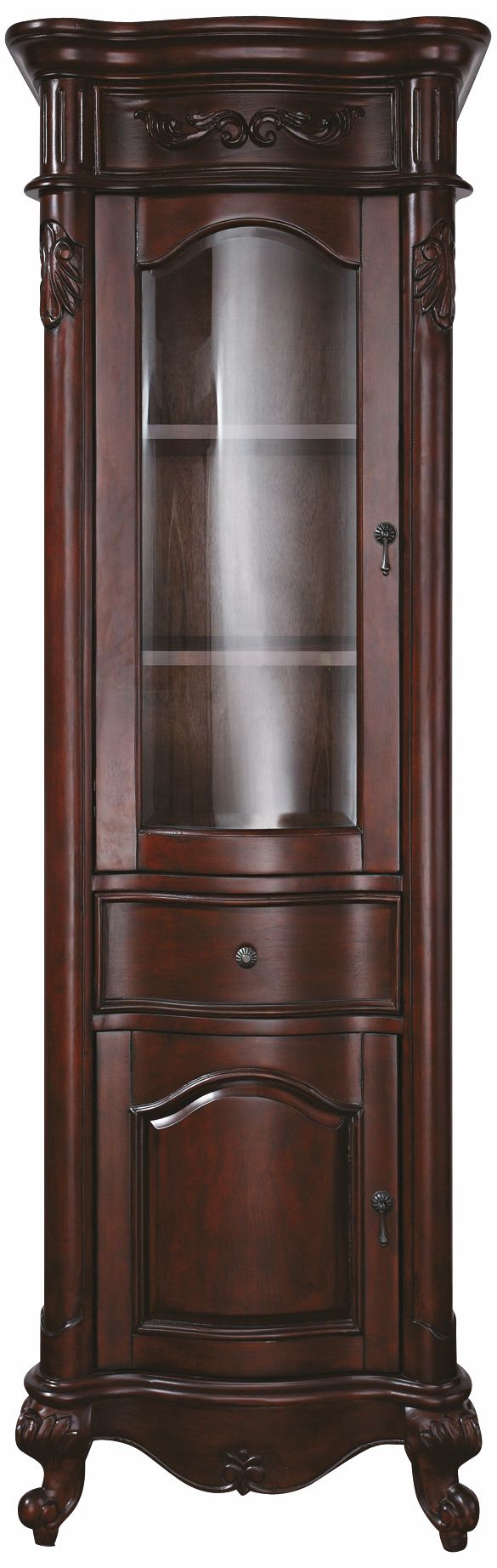 This bright antique cherry finish free-standing linen tower is a classically beautiful way to update your bath or dressing area. The solid wood construction includes detailed carvings on the legs, corners and front while antique brass finish hardware adorns the glass and soft-close doors and single drawer. From Avanity.