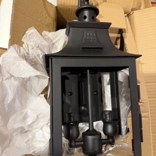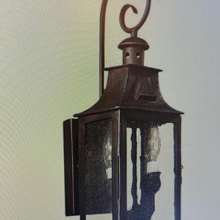 - Traditional three-light outdoor wall lantern from the Quoizel brand. Top scroll arm accent. Flared lantern style hood.