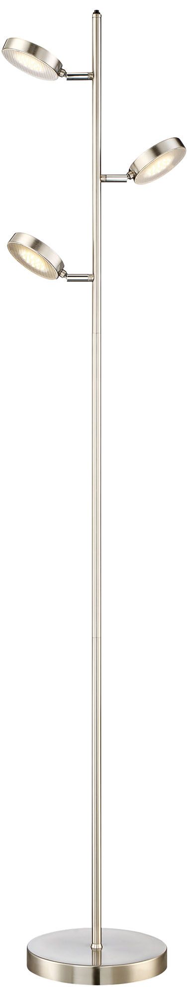 Economical both in energy usage and design, this minimalist, three-light brushed nickel floor lamp is a delight in any modern space. A slender post of iron rises up from a simple round base, reaching three adjustable discs that each house an energy-saving LED module. Ideal for reading, general lighting, and bathing particular features of a room in efficient illumination and sleek style. From Quoizel.