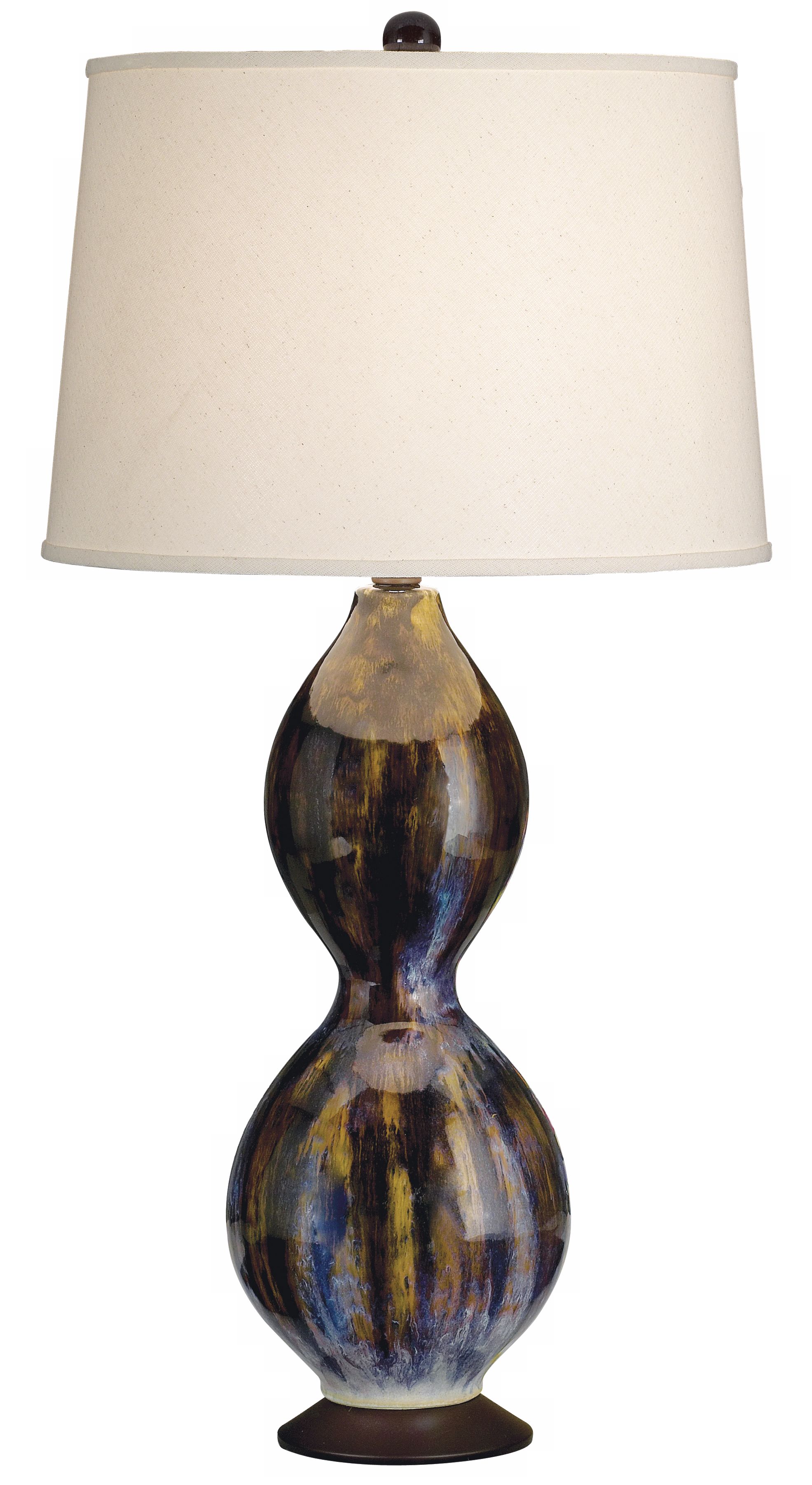 An expressive, modern design with a richly colored ceramic base. Double gourd table lamp base design is in a blended blue glaze. Topped by a white drum shade. 3-way socket.
