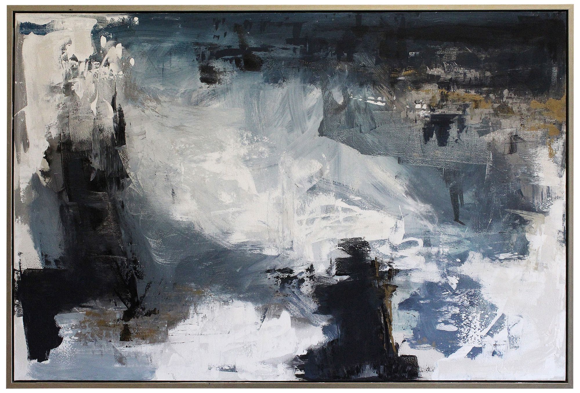 The Riptide wall art piece is a gorgeous hand-painted canvas within a rectangular frame featuring a brushed silver finish. The swirls and brushstrokes give the feeling of moving water, such as ocean waves or river rapids. Stunning gold accents highlight this painting's palette of grays, blues, white, and black.