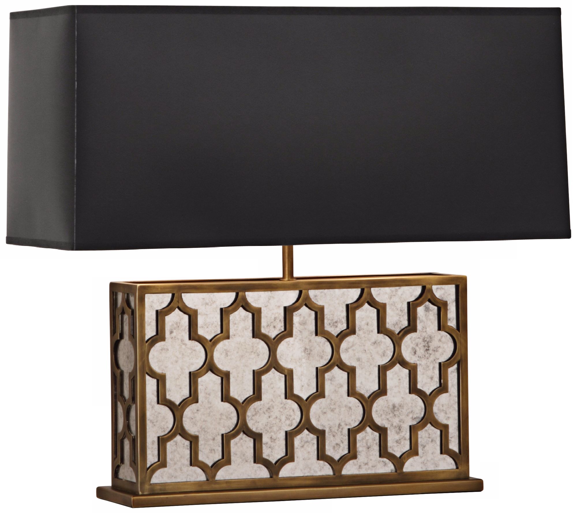 With a distinctive black shade with a matte gold lining, the Addison table lamp from Robert Abbey adds some mystery and style to your decor. Beautiful aged brass finish has antique mirror glass ornamental accents in a decorative pattern around its rectangular base. These patterns create a great effect with the light that bounces off the shade's lining to give this piece a warm, luminous glow. Wonderful piece for transitional decor.