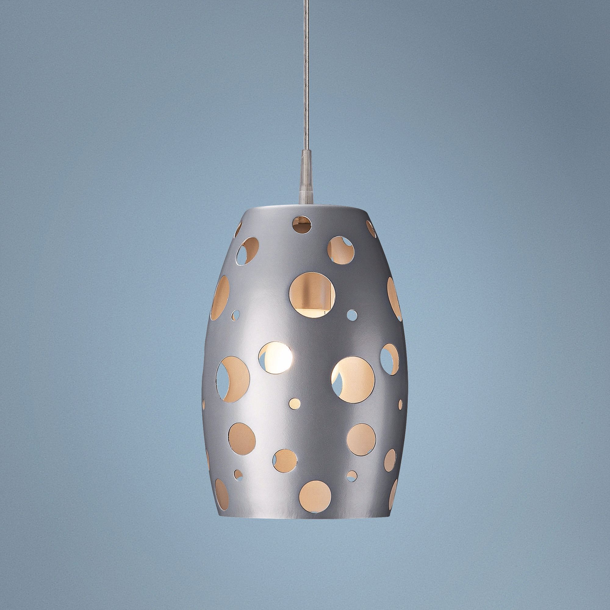 With a distinctive cut-out circle pattern, this brushed nickel mini pendant light light offers trend-setting contemporary style. The bullet style shade is suspended from the ceiling by a matching brushed nickel finish canopy and cable. Part of the Roomstylers collection of modern, stylish lighting fixtures.