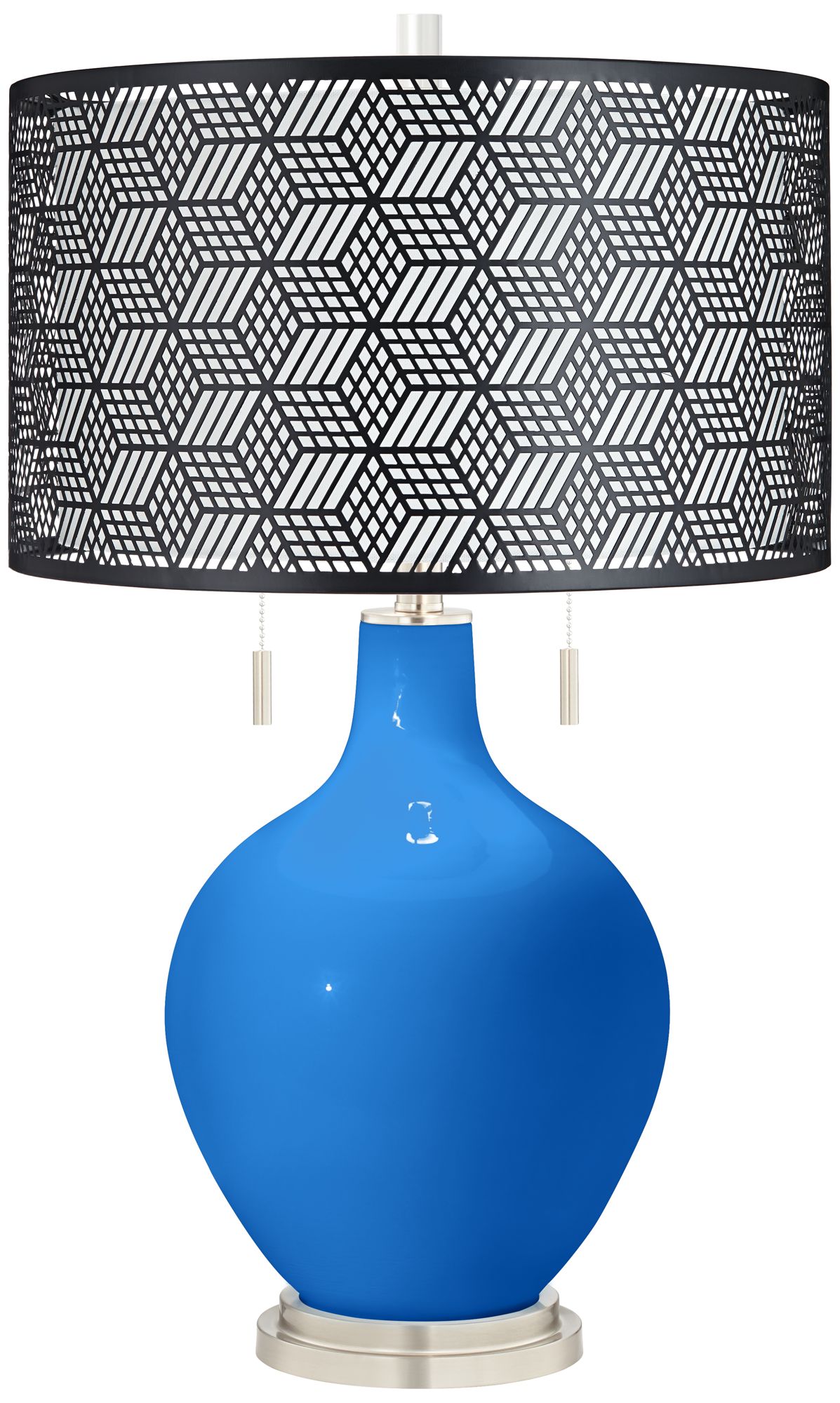 Bring exquisite style and designer color home with the Toby Color + Plus™ table lamp in beautiful Royal Blue. The design is hand-crafted by experienced artisans in California, and is completed by a brushed nickel finish base and pull chains. A black metal drum shade sits on top, drawing the look together in contemporary style. Lamp base U.S. Patent # 8,899,798.