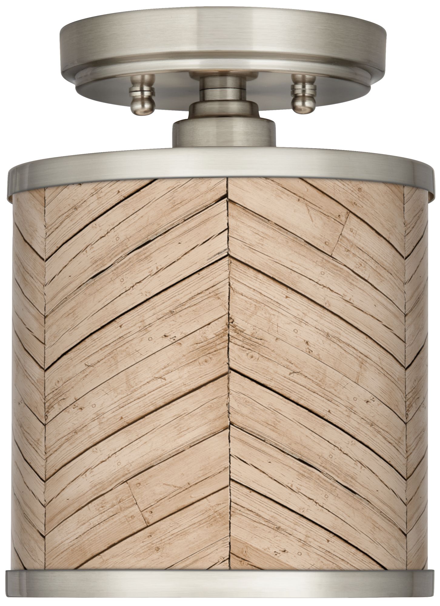 This contemporary semi-flushmount ceiling light is small in size, making it perfect for tight spaces. It comes in a brushed nickel finish metal frame, which supports a Rustic Woodwork print shade with the cylindrical silhouette.