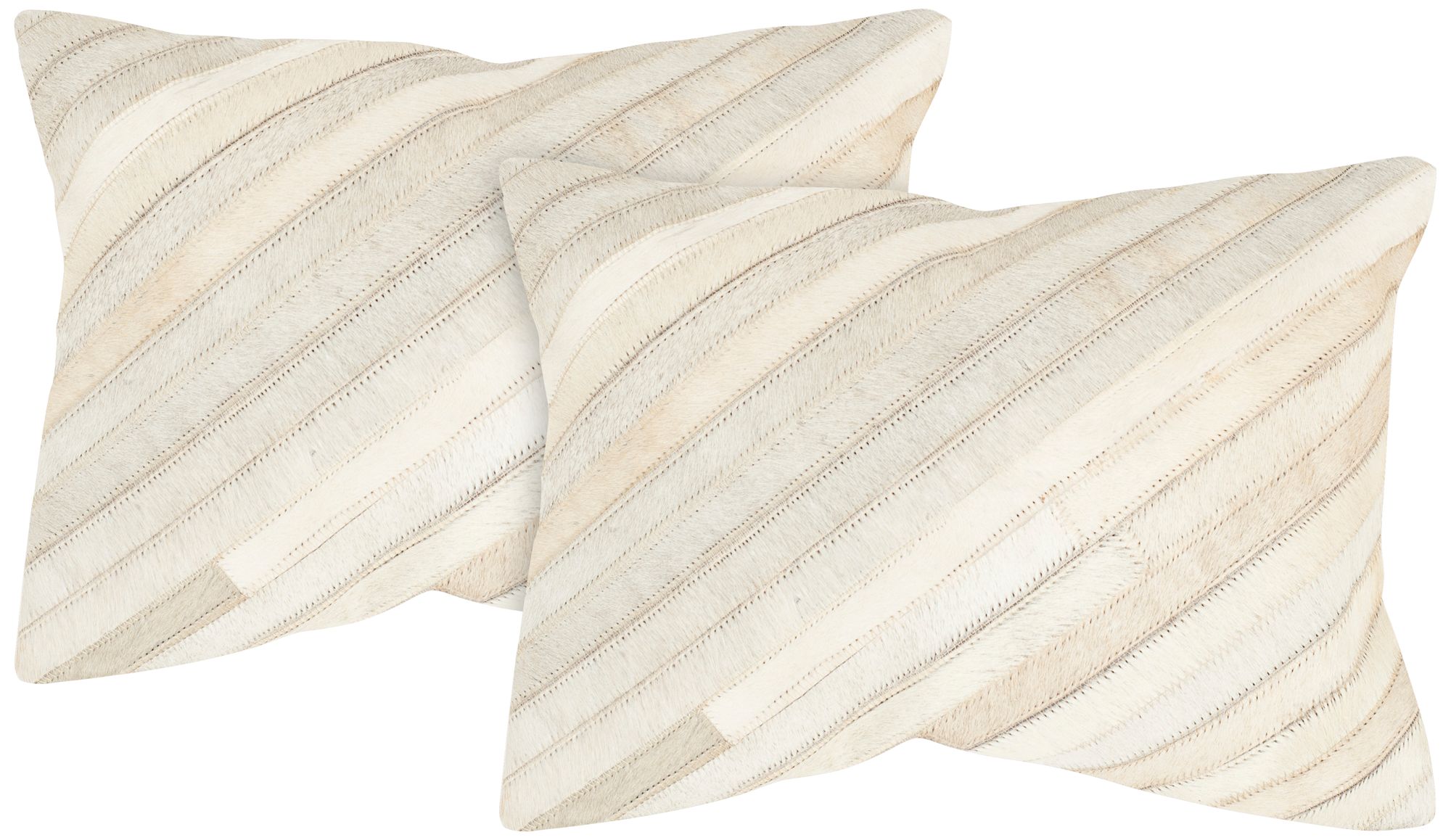 A set of 2 neutral-hued rectangular pillows showcasing a diagonal striped pattern created in shades of white cowhide. Completed with a solid suede backing, hidden zipper and feather insert, these luxurious pillows instantly upgrade any room in the home. A striking decorative pillow design from Safavieh.