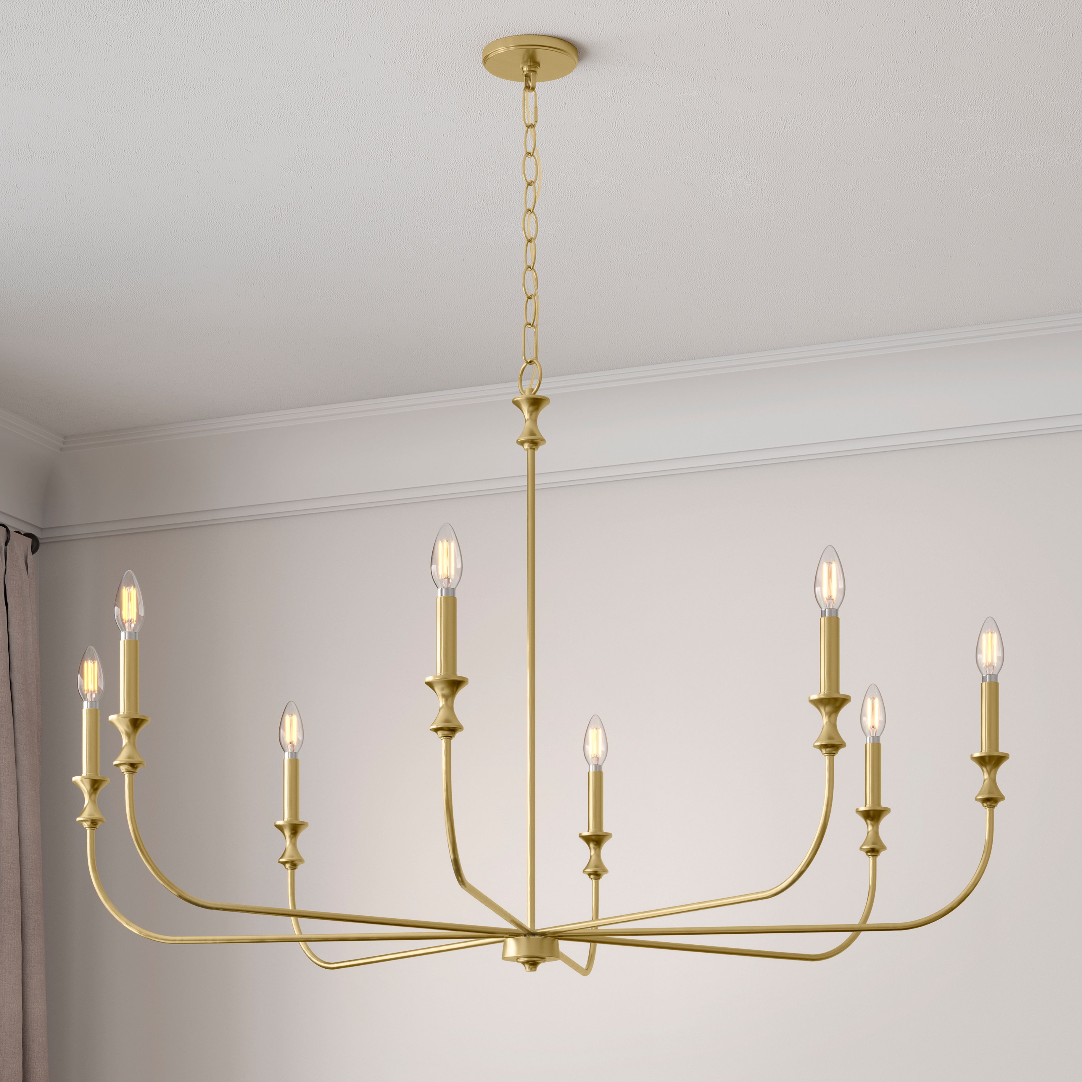 Refined in every detail, this traditional candle-style eight-light chandelier recalls early American silhouettes with crisp clarity. From the Savanne collection, its vintage brass profile includes subtly flared candle cups and gently arched arms for a clean, composed presence. Use it to lend quiet sophistication to a formal dining room or traditional parlor.