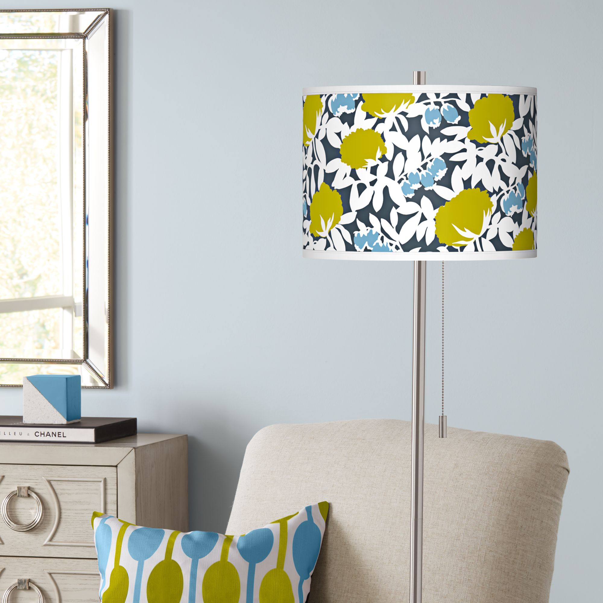 The base of this floor lamp has a modern look that pairs well with the unique personality of a giclee art shade. The shade is printed by the same technique used in reproducing museum-quality artwork. The bold and graphic Hedge shade pattern is from acclaimed textile designer Thomas Paul. His on-trend designs are inspired by vintage fabrics and motifs, and offer a fresh, up-to-date accent for any home. The base features a cool, brushed nickel finish and has an on/off pull chain. U.S. Patent # 7,347,593.