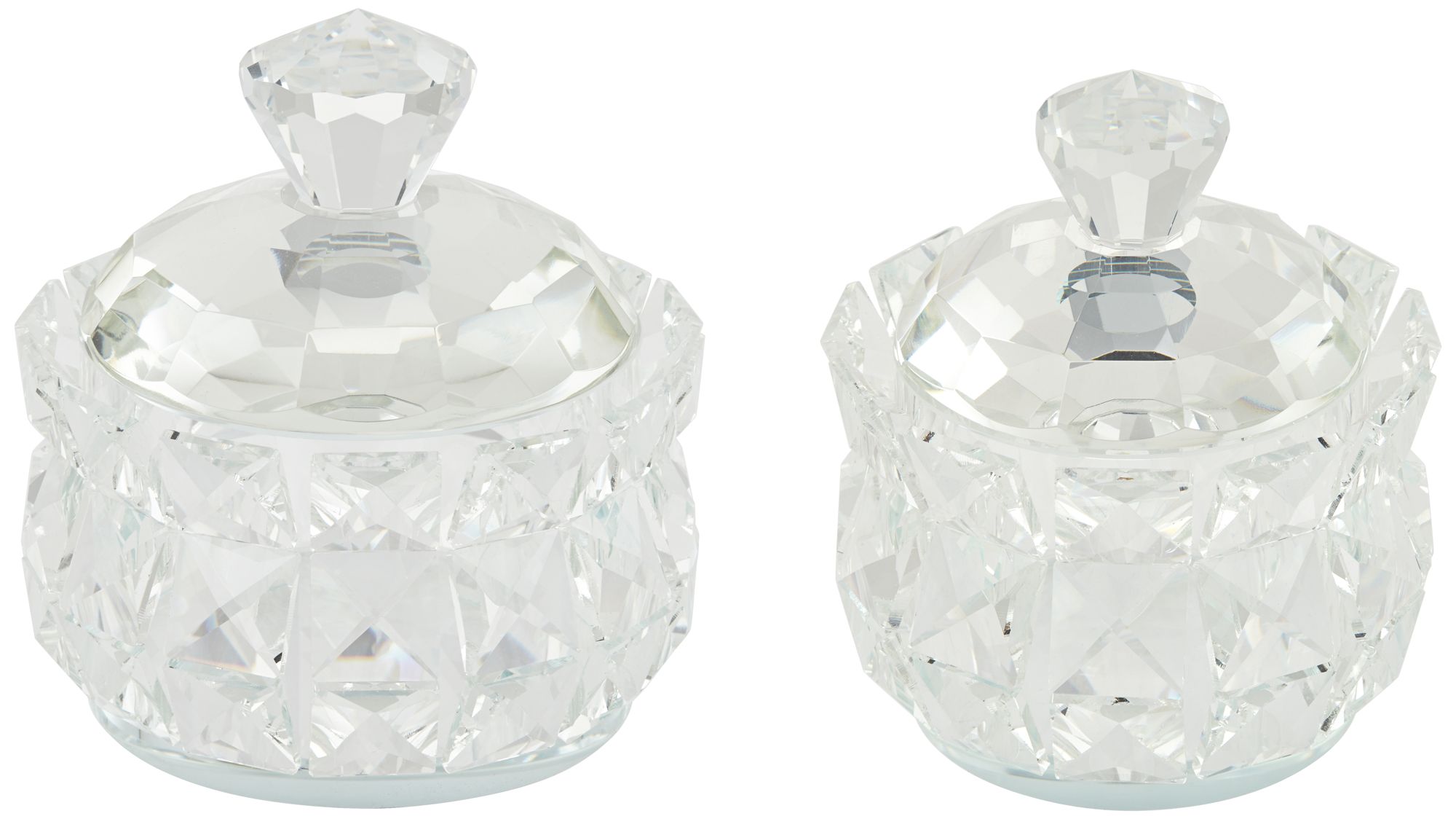Dress up a vanity table with a glittering touch of glam and glitz. This set of two hand-polished, clear glass jewelry boxes flaunts a luxurious diamond motif that shimmers and shines in the light. Stash away jewelry and small accessories in these effortlessly elegant boxes from the Seely collection.