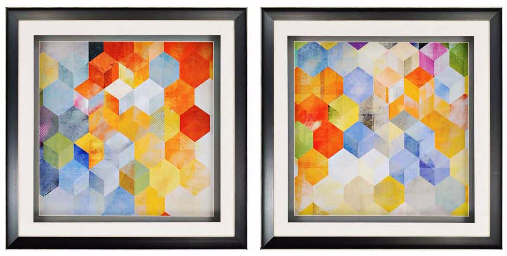Perfect for modern and contemporary decor styles, these two wall art designs have a bright geometric cube print. Easily add them to a room for a pop of color. Traditional sawtooth mounting hardware makes this design easy to hang.
